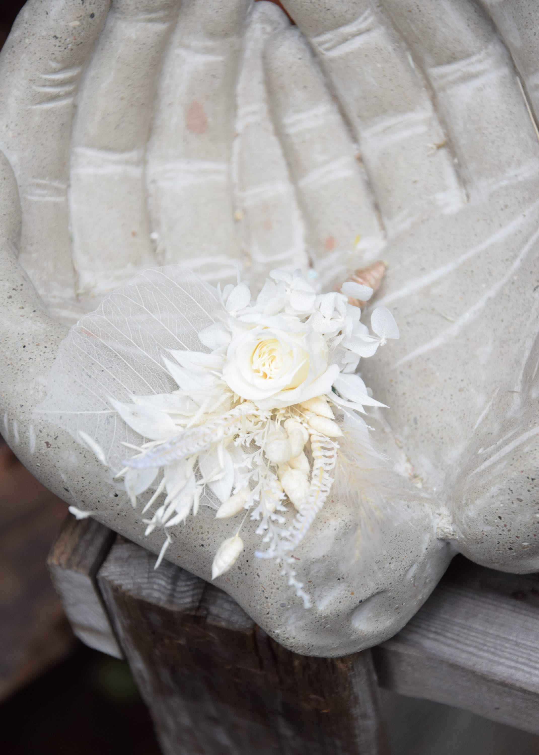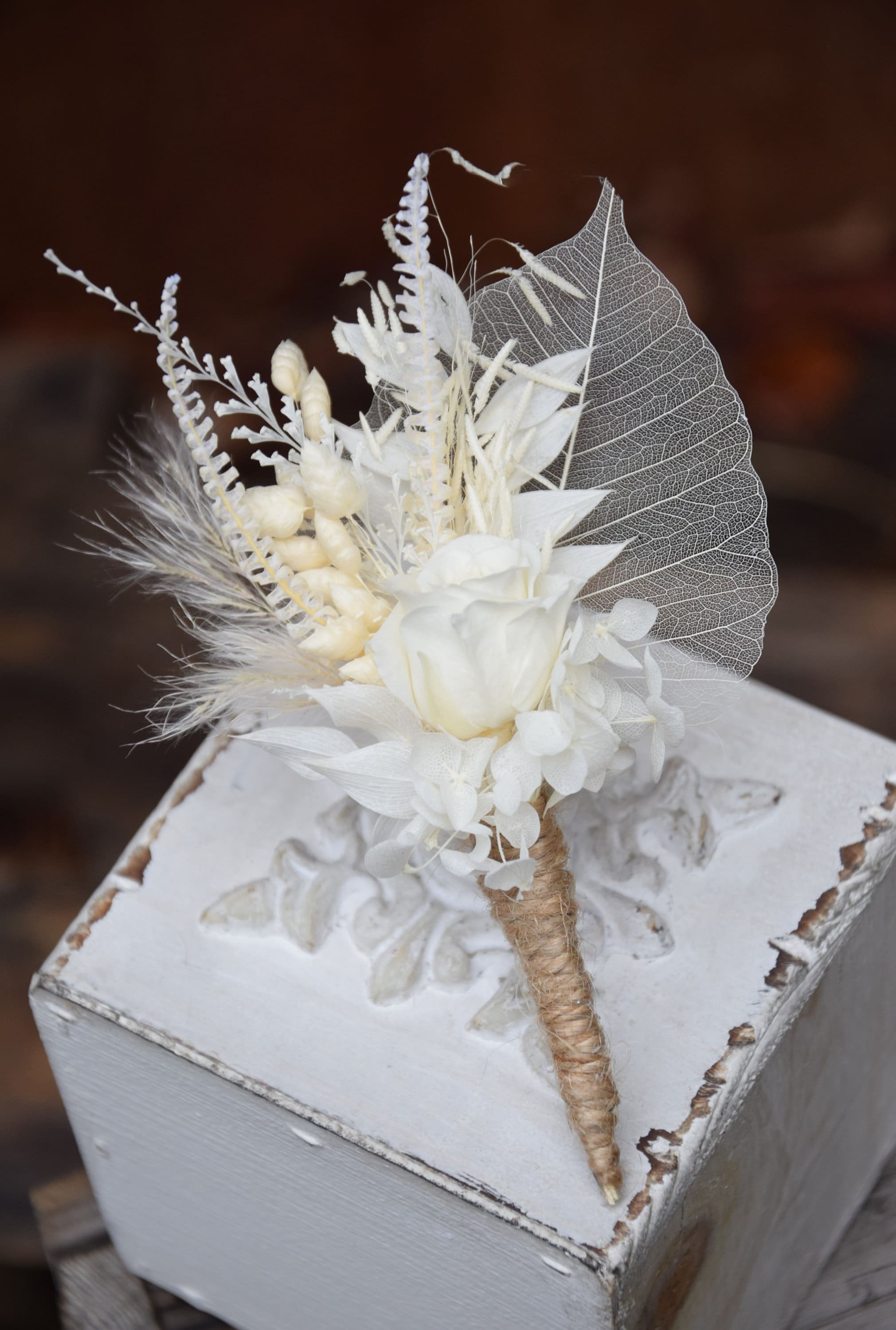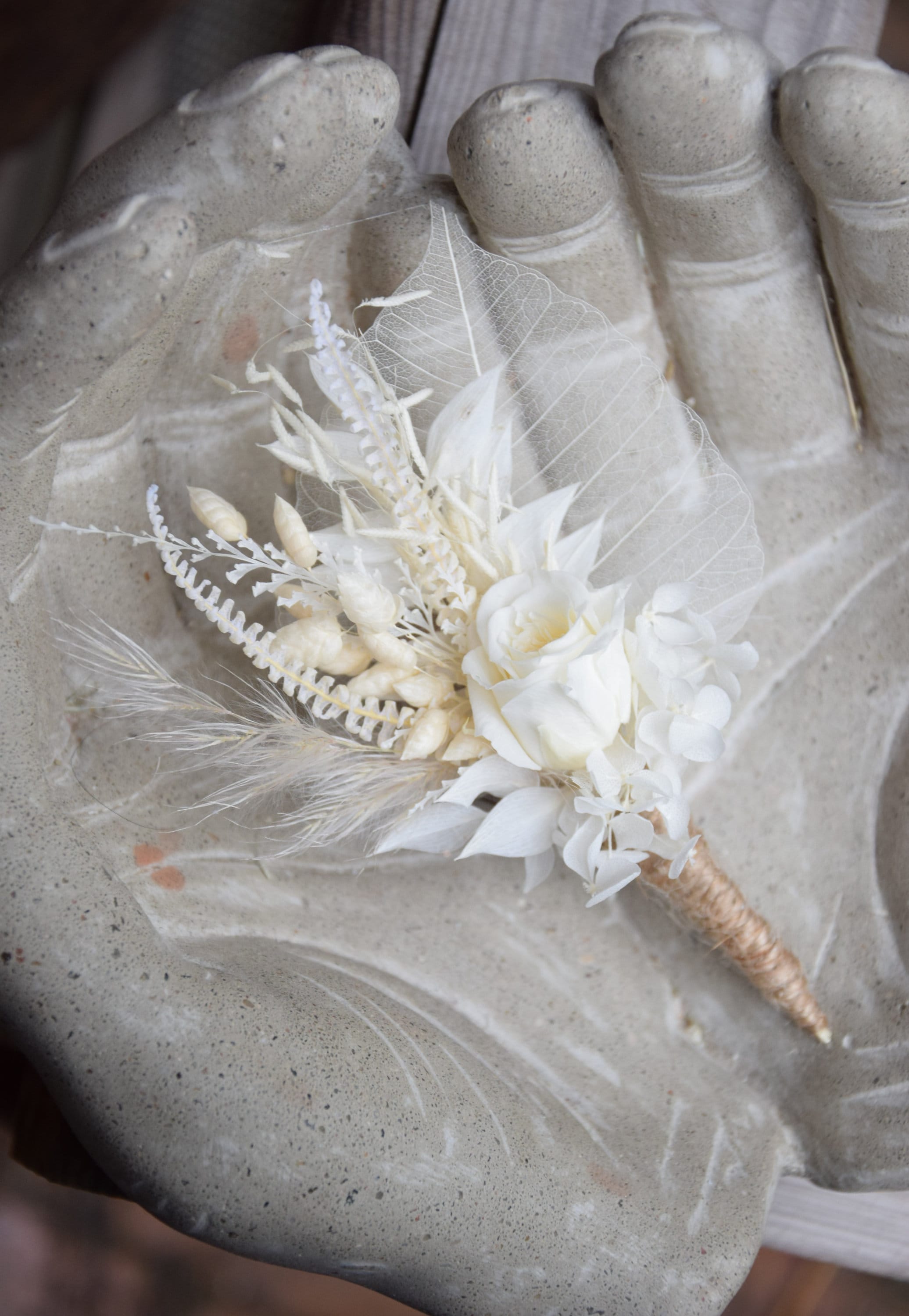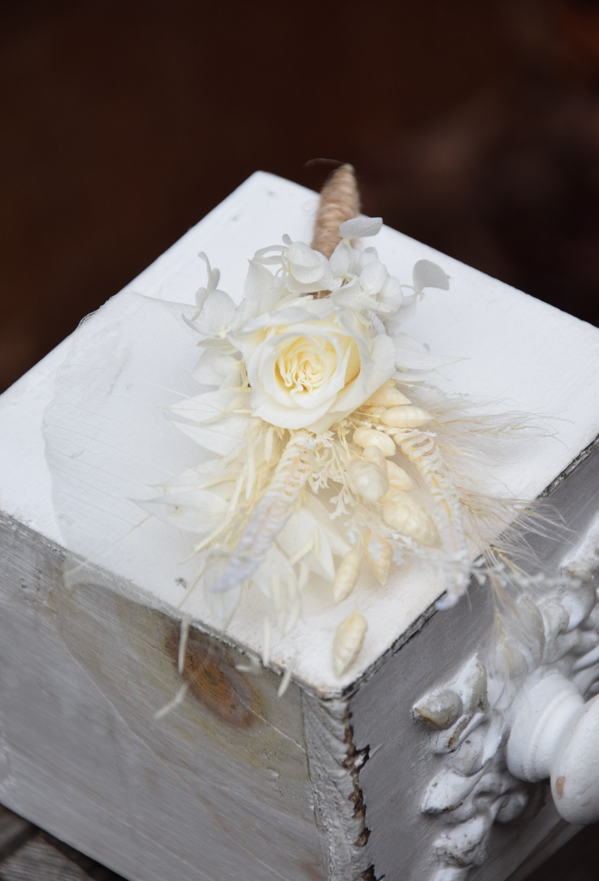 Biała butonierka dla pana młodego z stabilizowaną różą