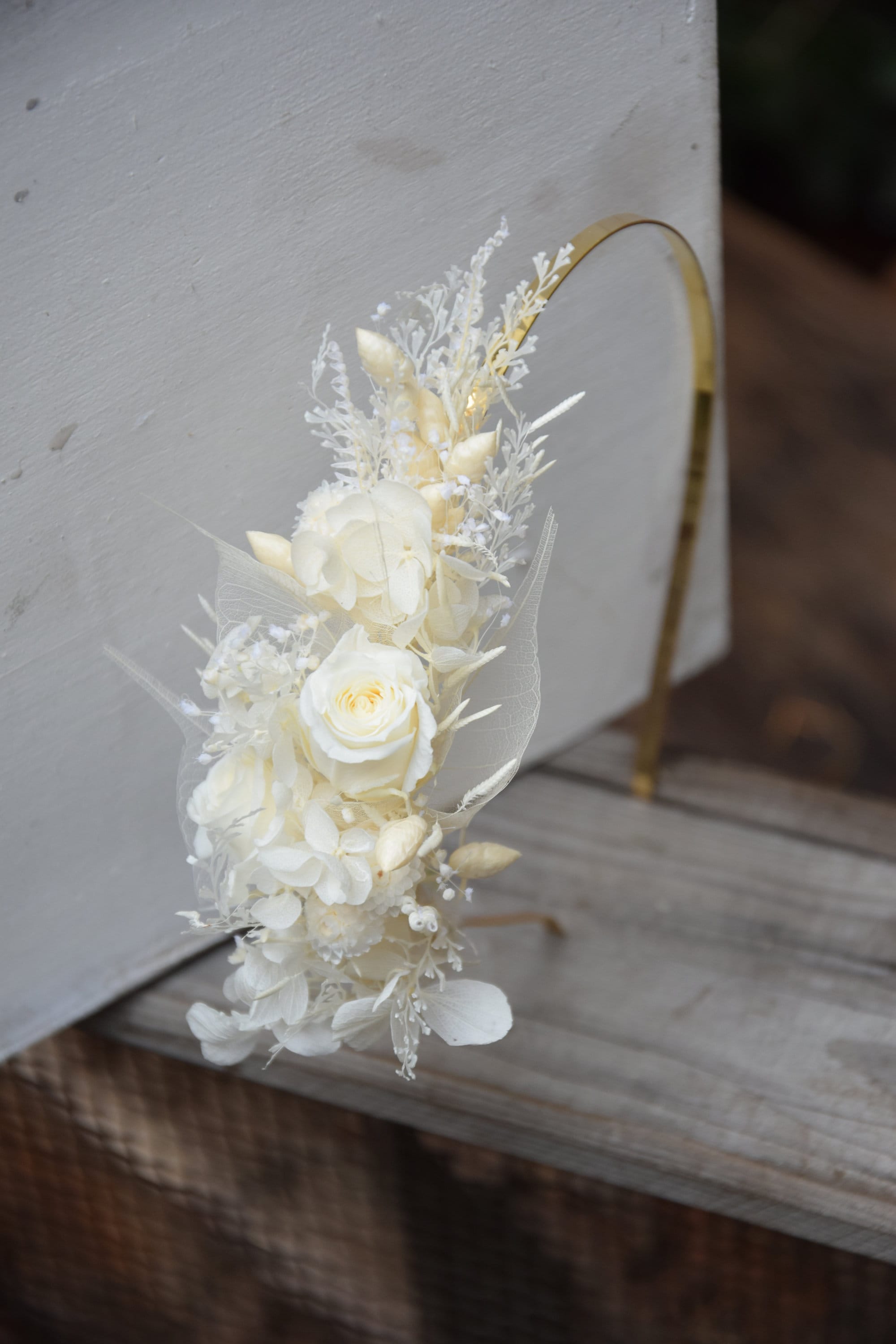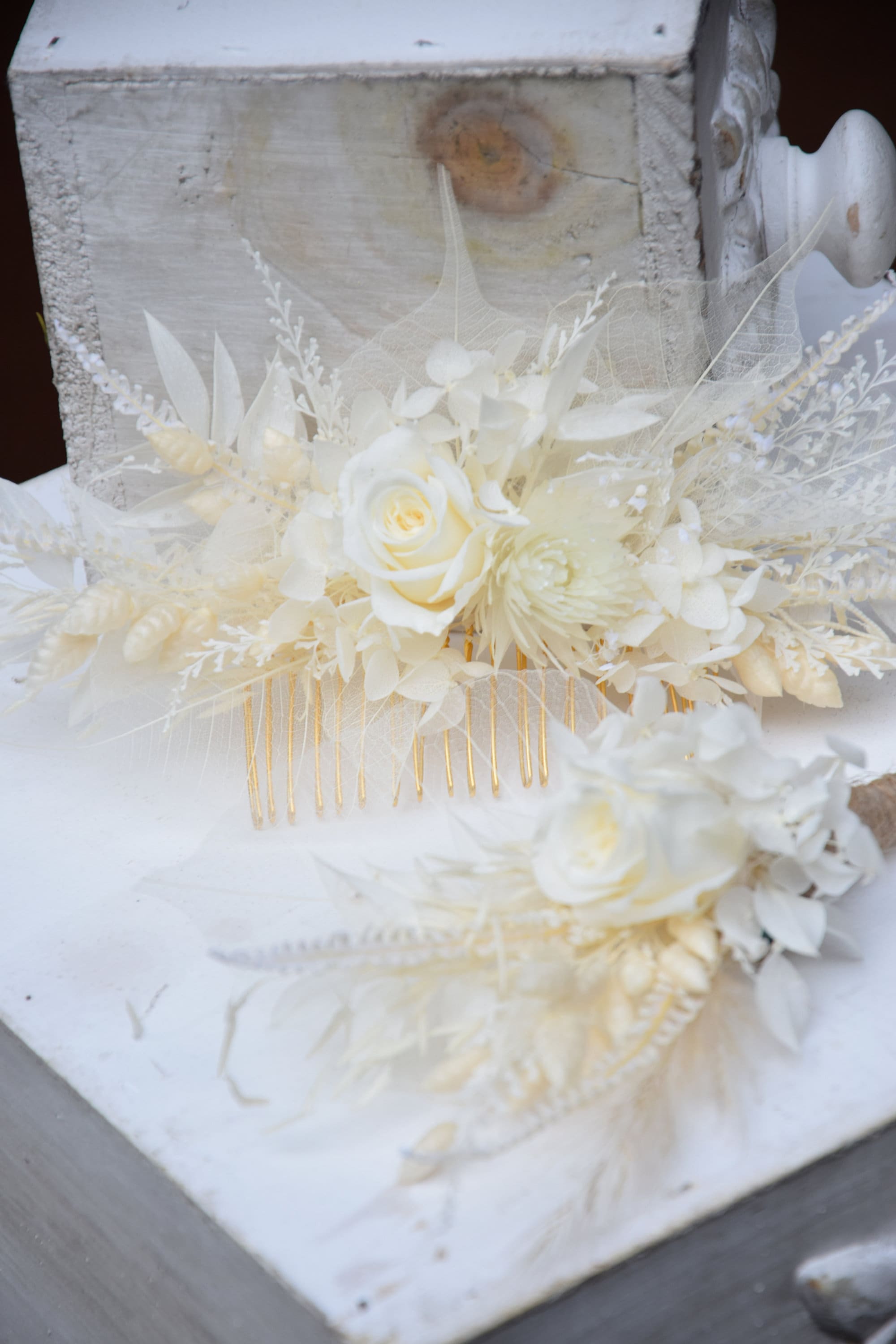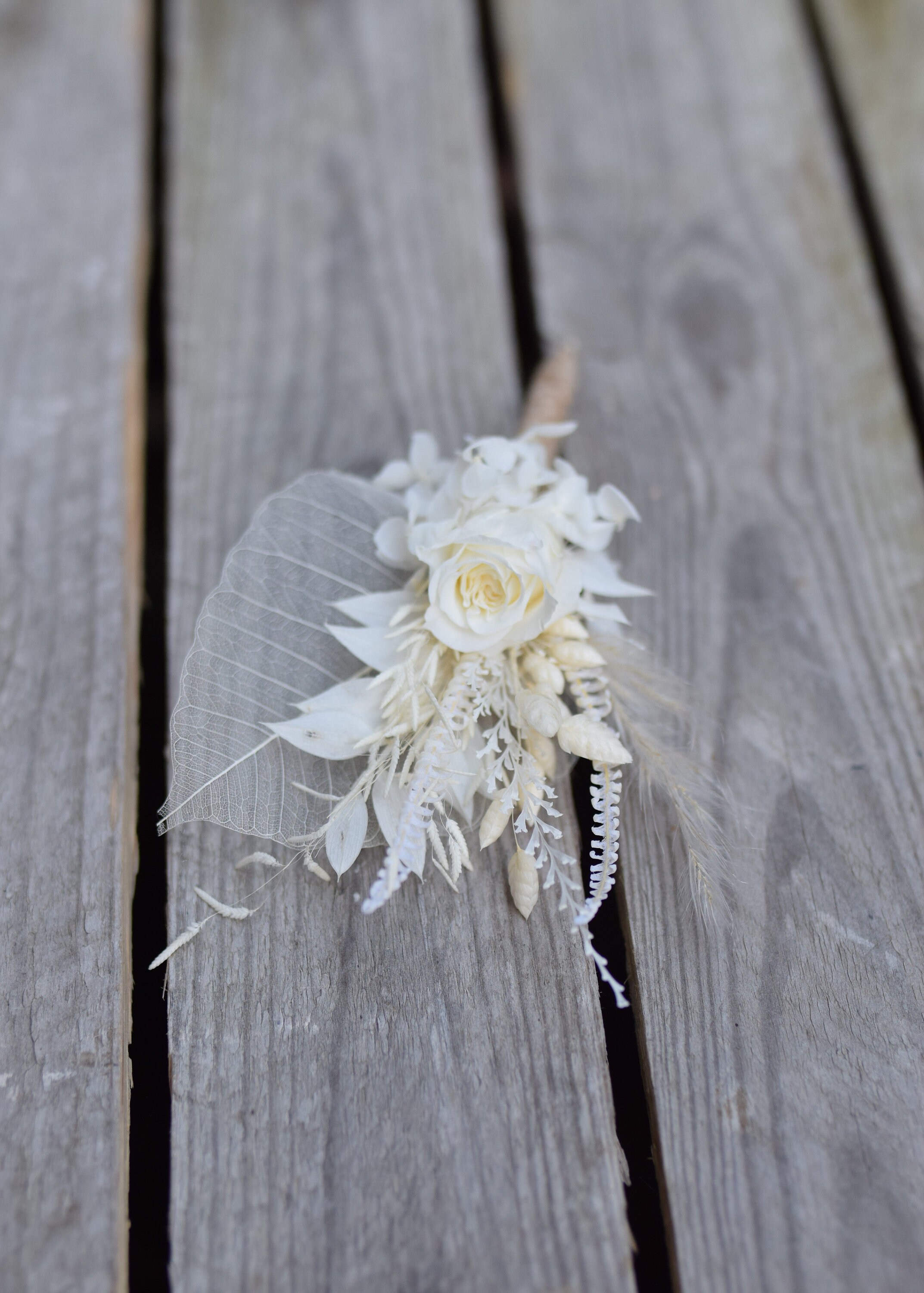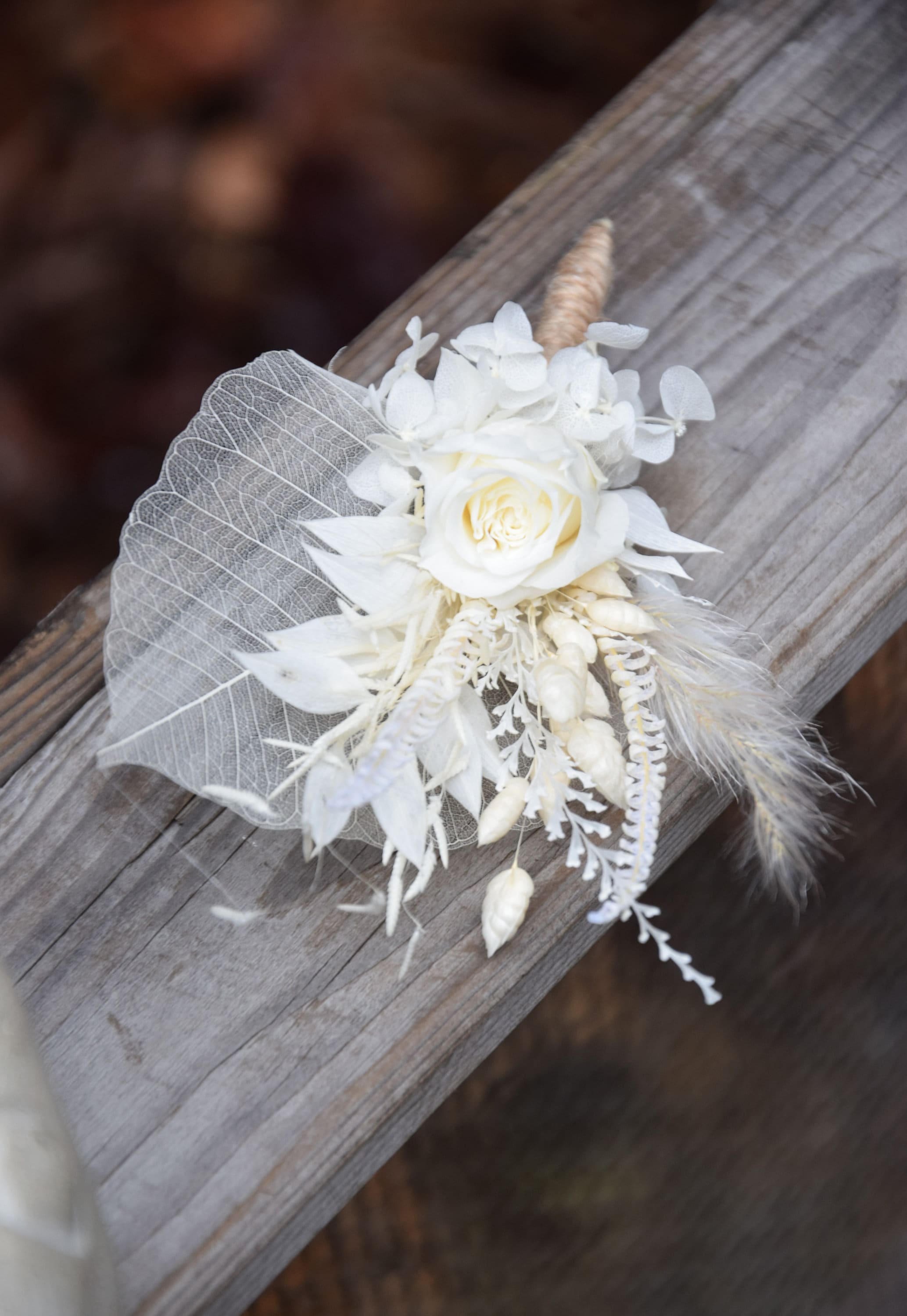 Biała butonierka dla pana młodego z stabilizowaną różą
