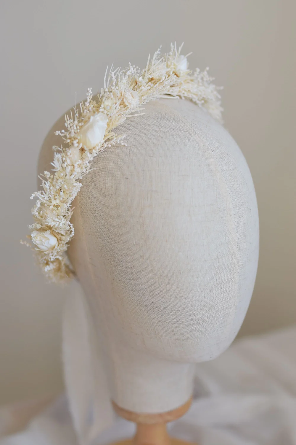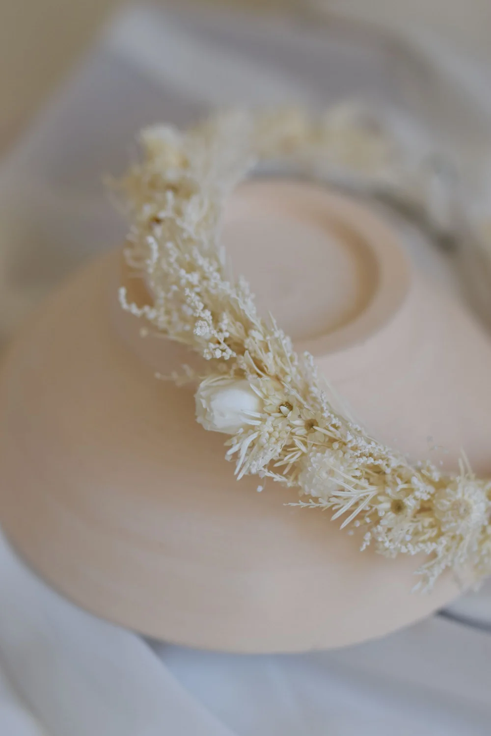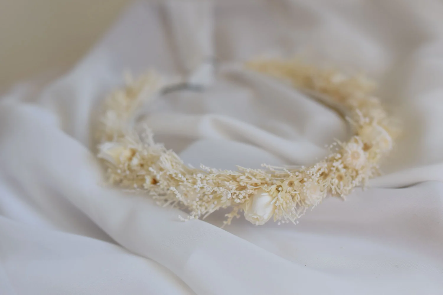 Delikatny biały wianek na głowę wykonany ręcznie z suszonych i stabilizowanych roślin w naturalnych odcieniach bieli i ecru. Subtelna kompozycja z drobnych kwiatów oraz stabilizowanych róż tworzy lekką, ponadczasową ozdobę, idealną do stylizacji komunijnych i ślubnych.