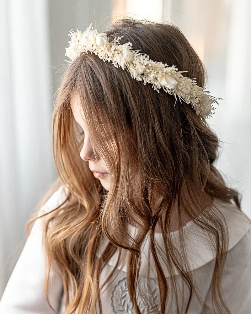 Biały, komunijny wianek na głowę z suszonych i stabilizowanych kwiatów