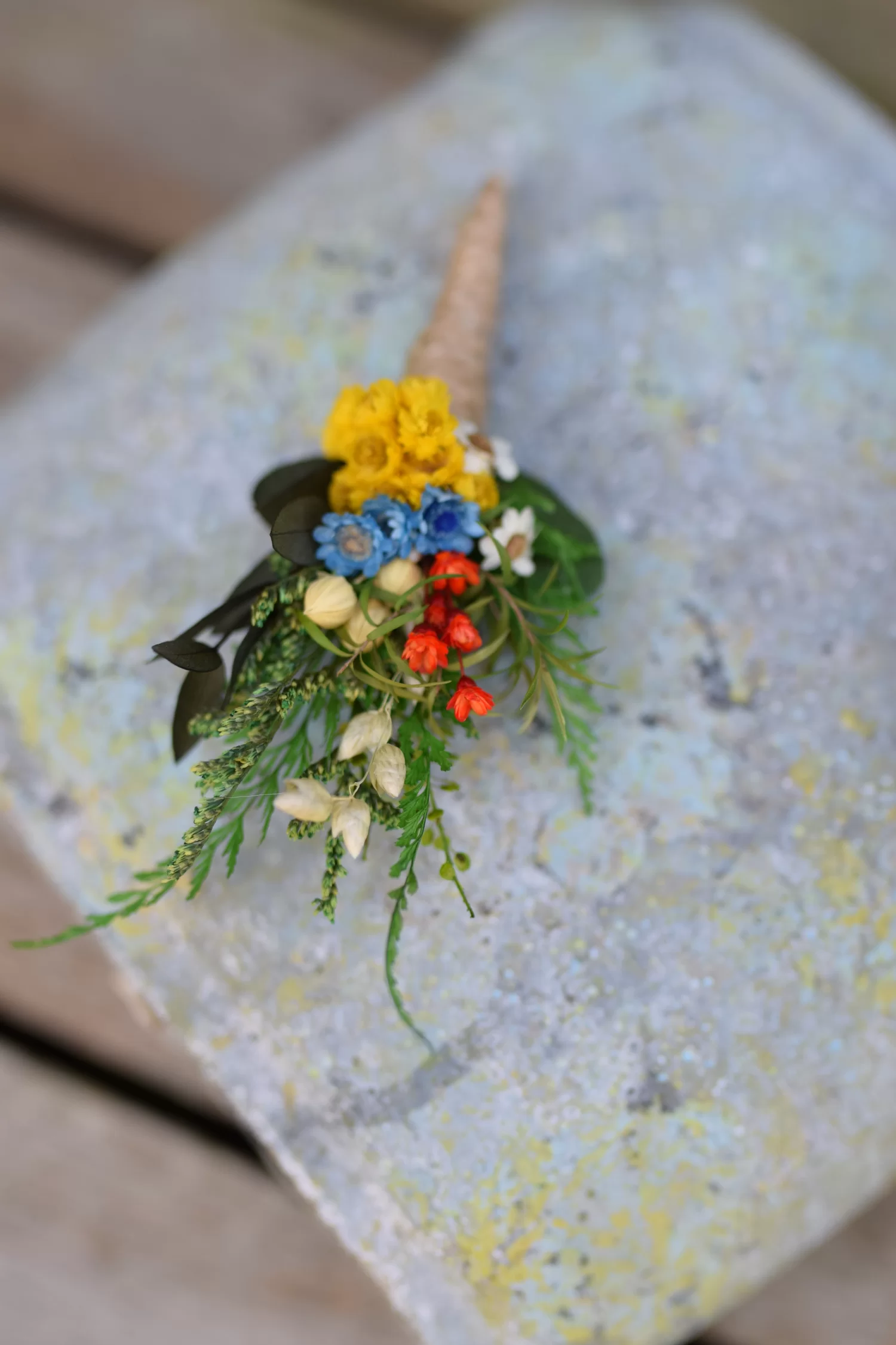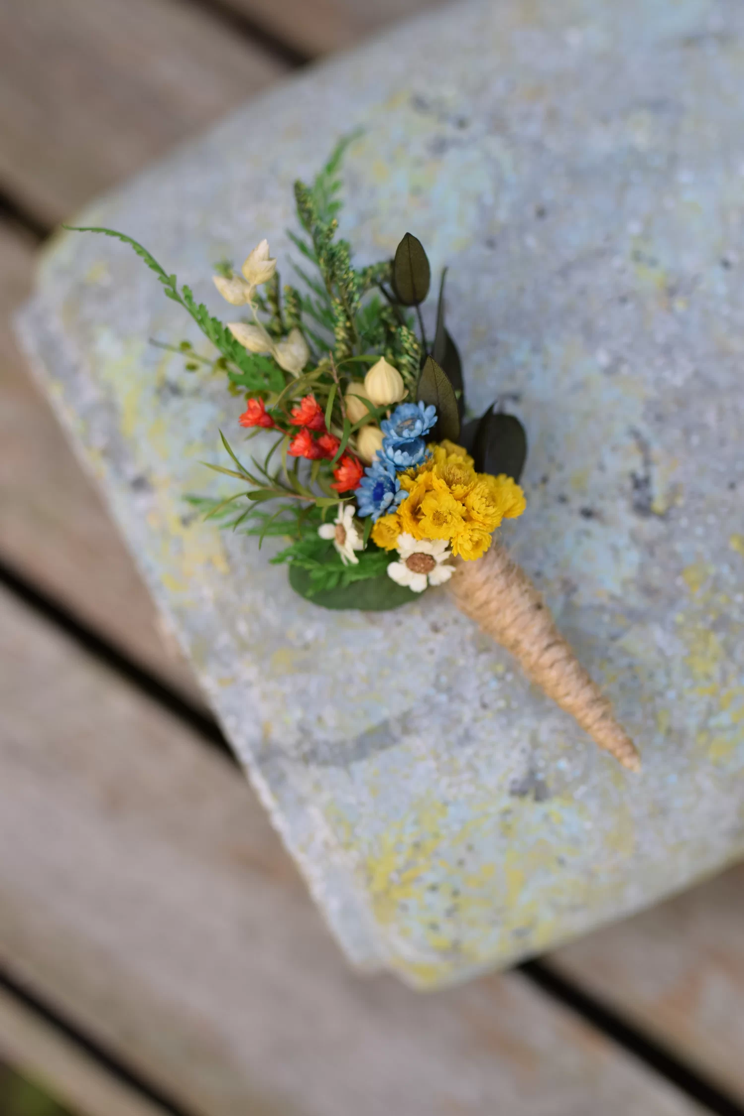 W tej wyjątkowej butonierce znajduje się stabilizowane i suszone rośliny. Całość wykończona jest naturalnym jutowym sznureczkiem. Butonierka wykonana jest z suszonych kwiatów zatem jest długotrwała. Aby była piękna przez bardzo długi czas wystarczy trzymać ja z dala od deszczu lub wilgoci.