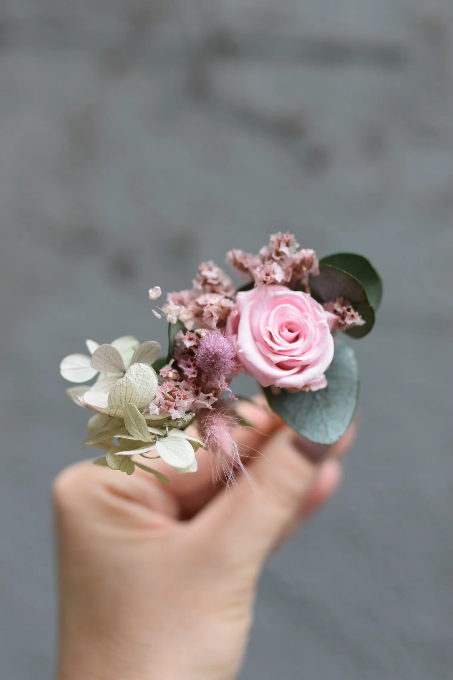Metalowa baza wsuwki gwarantuje trwałość, a kompozycja z suszonych i stabilizowanych kwiatów sprawia, że ozdoba ta zachowa swoją piękność przez wiele lat.