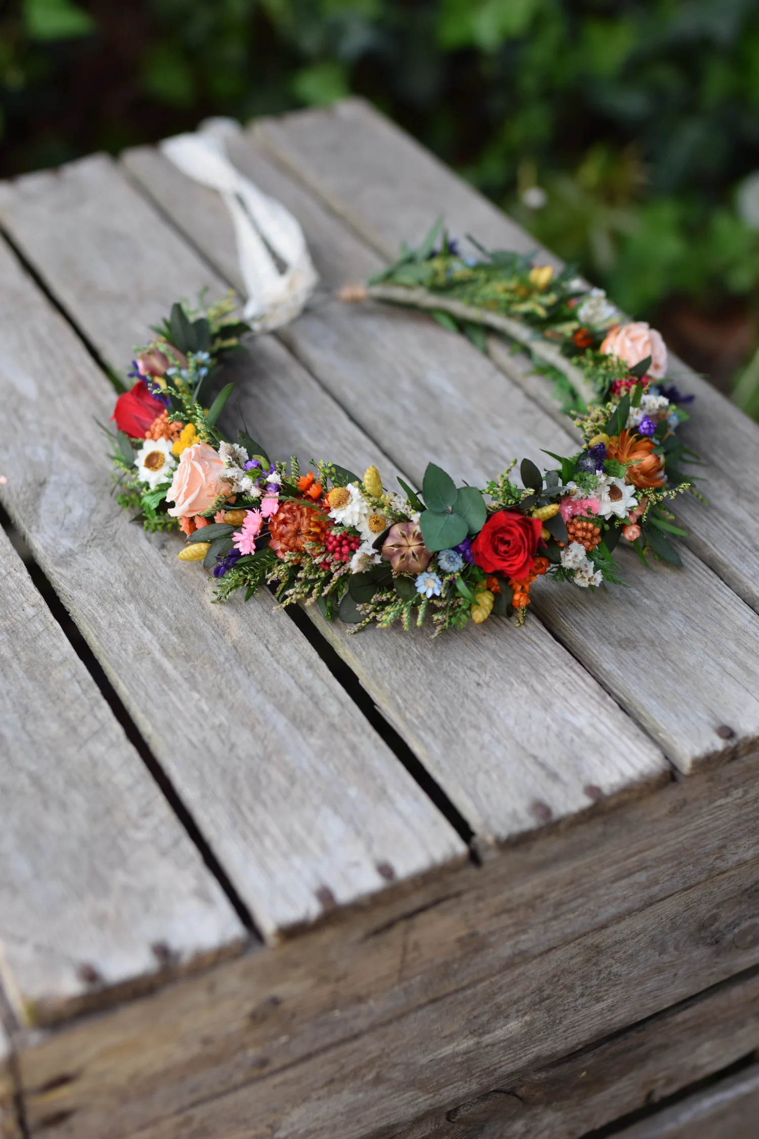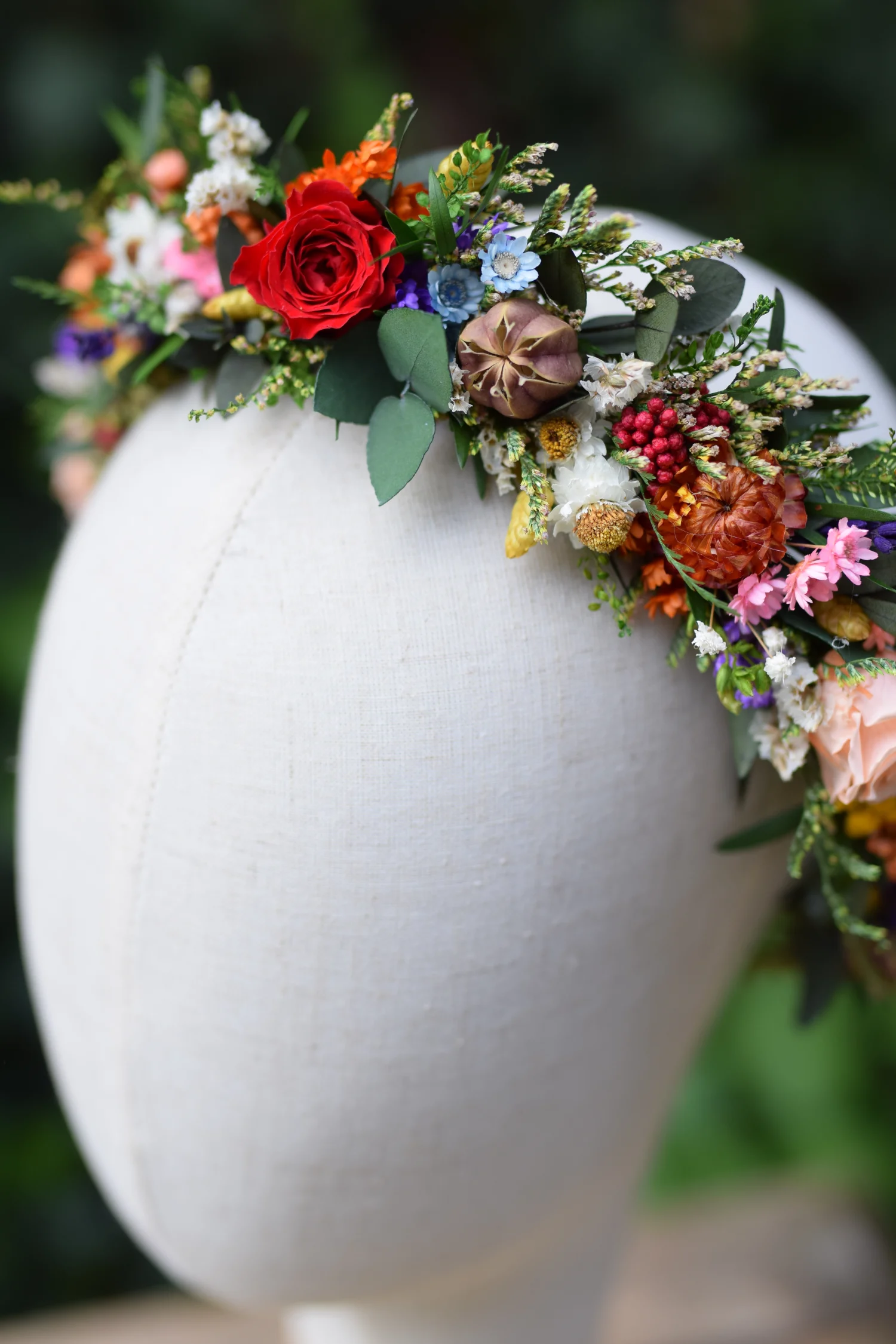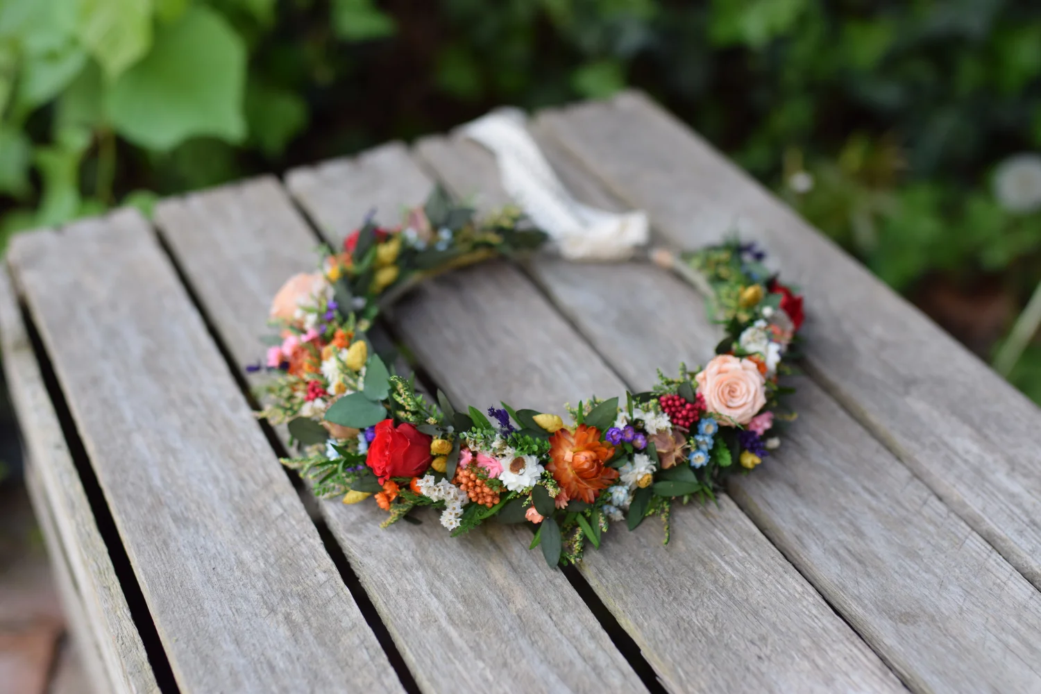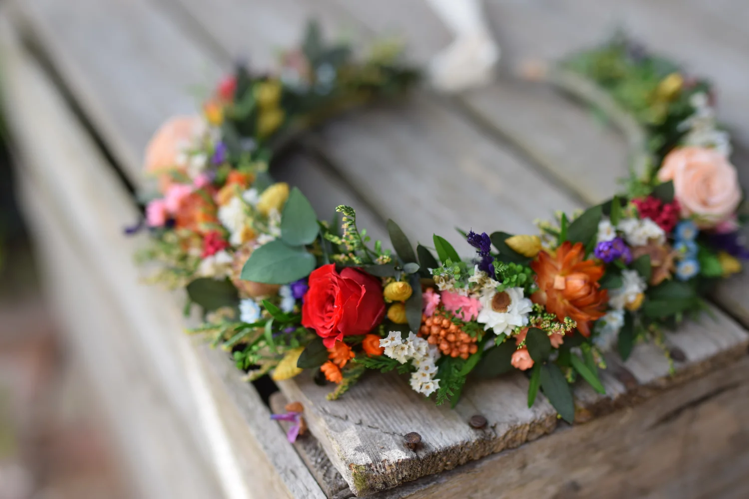 Rustykalny, kolorowy wianek na głowę z suszonych i stabilizowanych roślin to idealny dodatek do stylizacji Panny młodej lub druhny. W tym niespotykanym wianku znajduje się stabilizowany eukaliptus, drzewo herbaciane i inne kolorowe suszone i stabilizowane kwiaty . Wianek wykonany jest z niezwykłą dbałością o szczegóły Wianek na głowę to idealna propozycja na ślub, wieczór panieński oraz prezent, sesję zdjęciową, festiwal lub urodziny Rozmiar wianka jest uniwersalny - zawiązywany z tyłu na tasiemkę Suszone i stabilizowane rośliny są trwałe, pod warunkiem, że są odpowiednio przechowywane, czyli dala od światła słonecznego, aby uniknąć blaknięcia kolorów, źródeł ciepła, ekstremalnego zimna i wilgoci. Staram się tworzyć moje projekty kwiatowe tak, aby wyglądały jak na zdjęciu, ale ponieważ używam kwiatów naturalnych, mogą występować różnice w odcieniu. Jeśli chciałabyś zamówić więcej sztuk niż widzisz na liście, napisz do mnie , a ja z przyjemnością stworzę wybrana ilość dla Ciebie. Wiele z moich produktów to projekty indywidualne które tworzę na Wasze specjalne zamówienie. Byłabym bardzo szczęśliwa mogąc pracować z tobą, aby stworzyć dokładnie to, czego szukasz! I