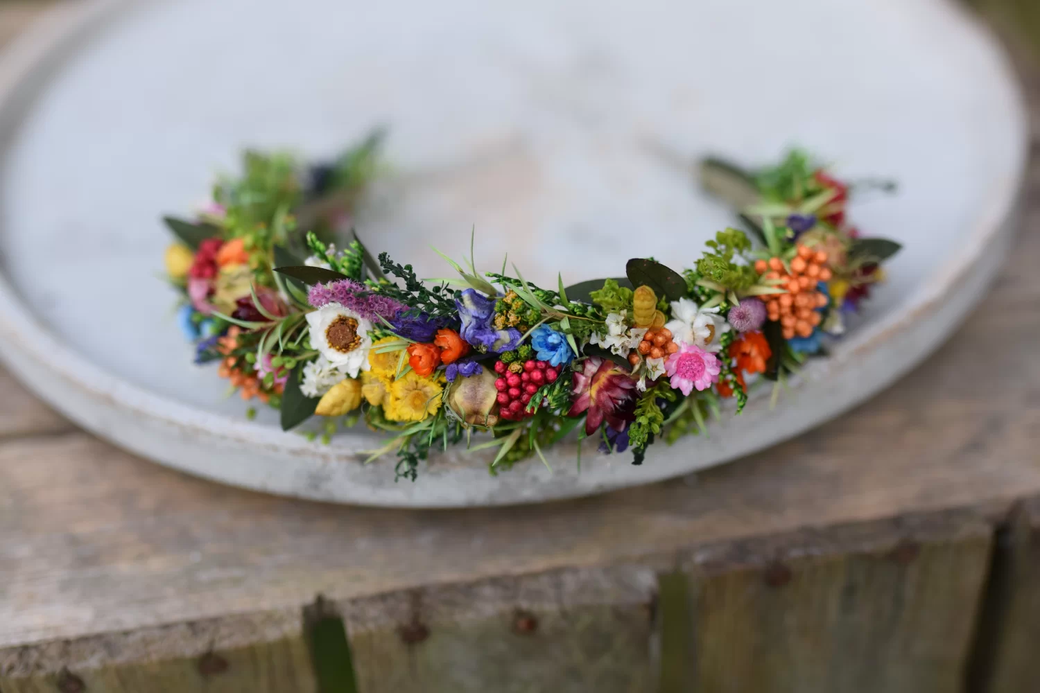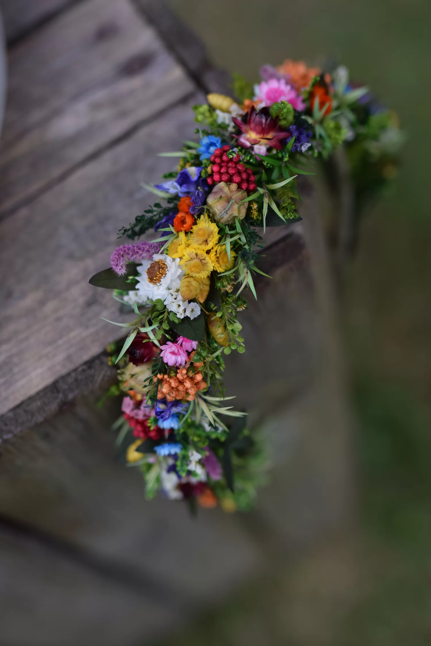 Kwiatowa opaska wykonana jest z stabilizowanego eukaliptusa, drzewa herbacianego i innych kolorowych suszonych i stabilizowanych kwiatów.