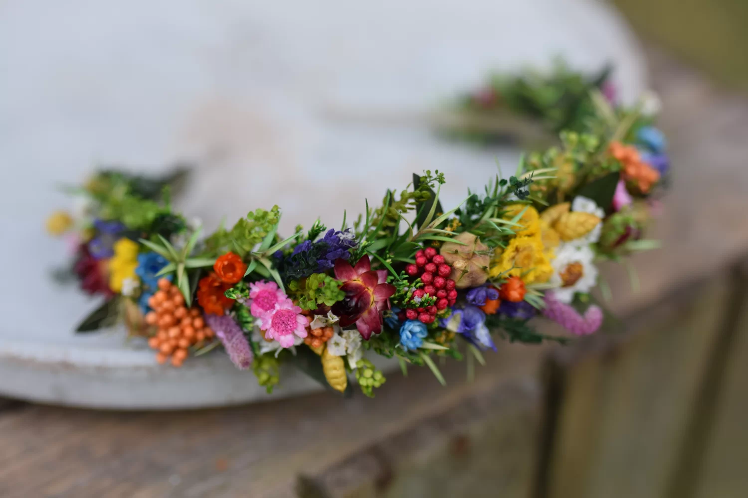 Rustykalna, kolorowa opaska na głowę z suszonych i stabilizowanych roślin to idealny dodatek do stylizacji Panny młodej lub druhny.