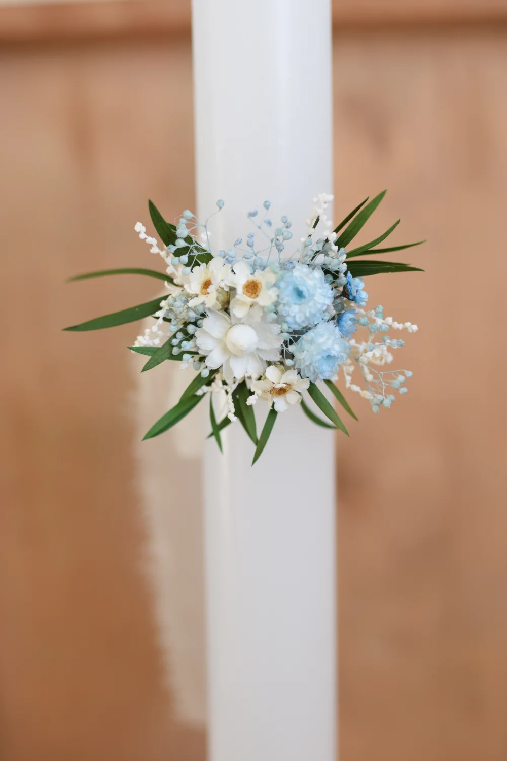 Ozdoba na świecę komunijną z kwiatów stabilizowanych i suszonych biało-błękitna