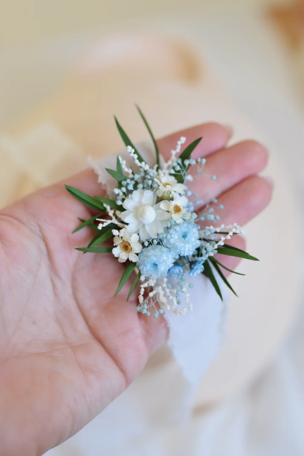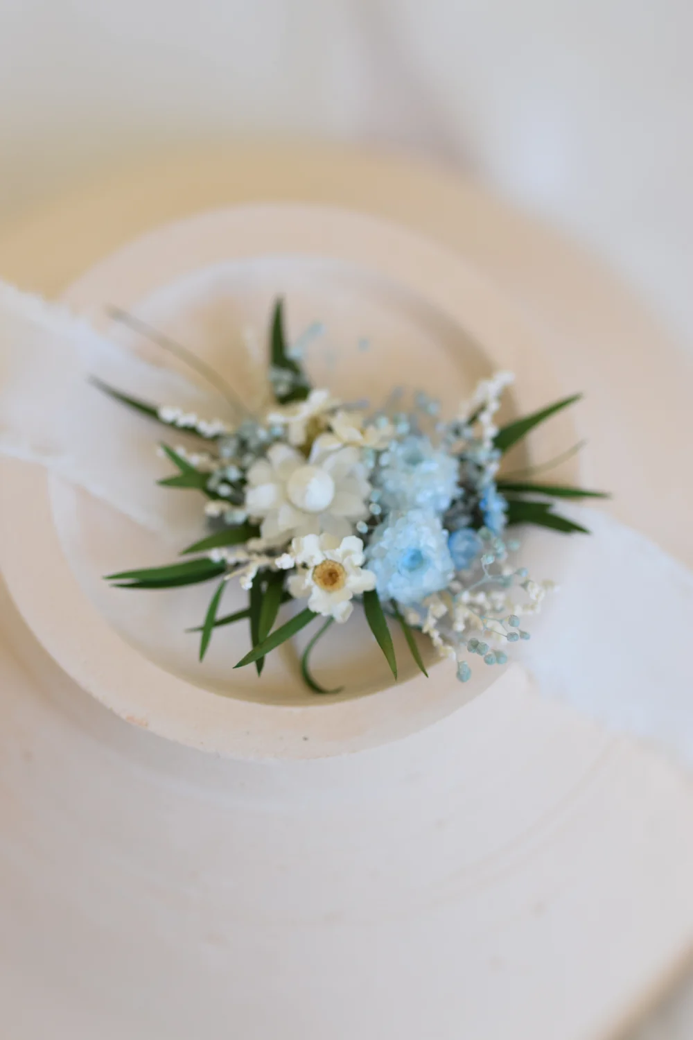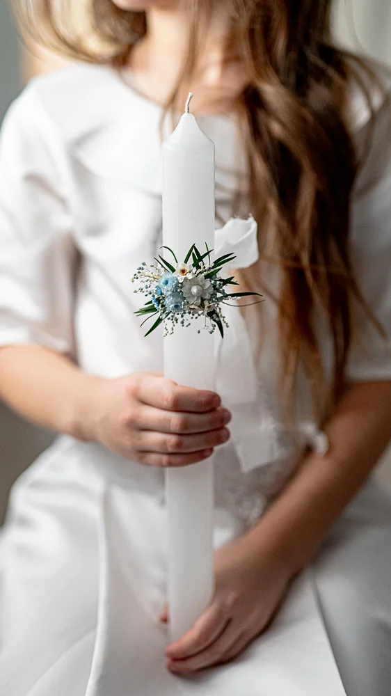 Delikatna, ręcznie wykonana ozdoba na świecę komunijną z kompozycji kwiatów stabilizowanych i suszonych w biało-błękitnej kolorystyce. Naturalna, lekka forma idealnie podkreśla wyjątkowy charakter Pierwszej Komunii Świętej.