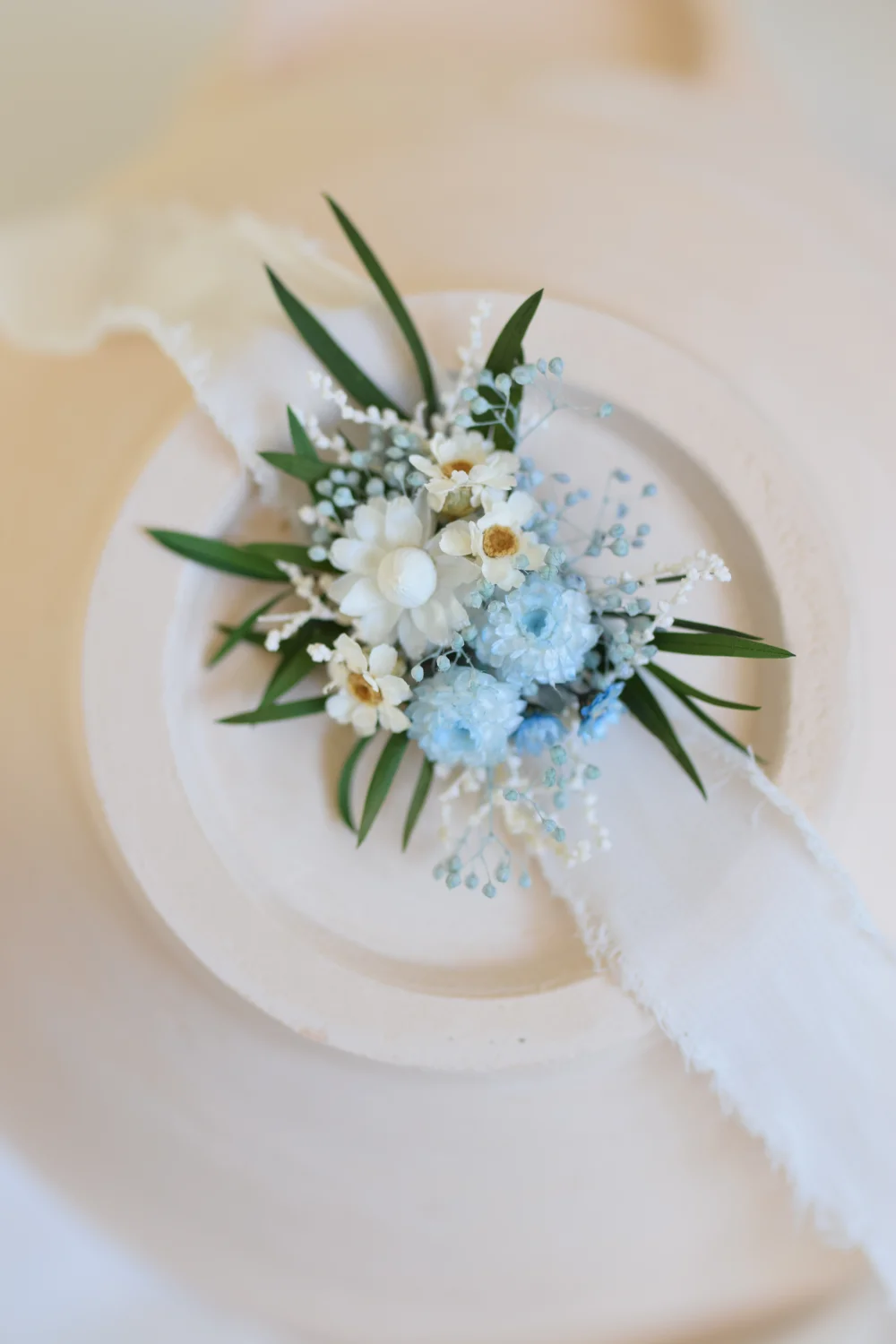 Ozdoba wiązana jest na szyfonowej wstążce, dzięki czemu pasuje do świec o różnych średnicach. Kompozycja składa się z drobnych kwiatów i roślin dekoracyjnych w odcieniach bieli i błękitu oraz zielonych dodatków.