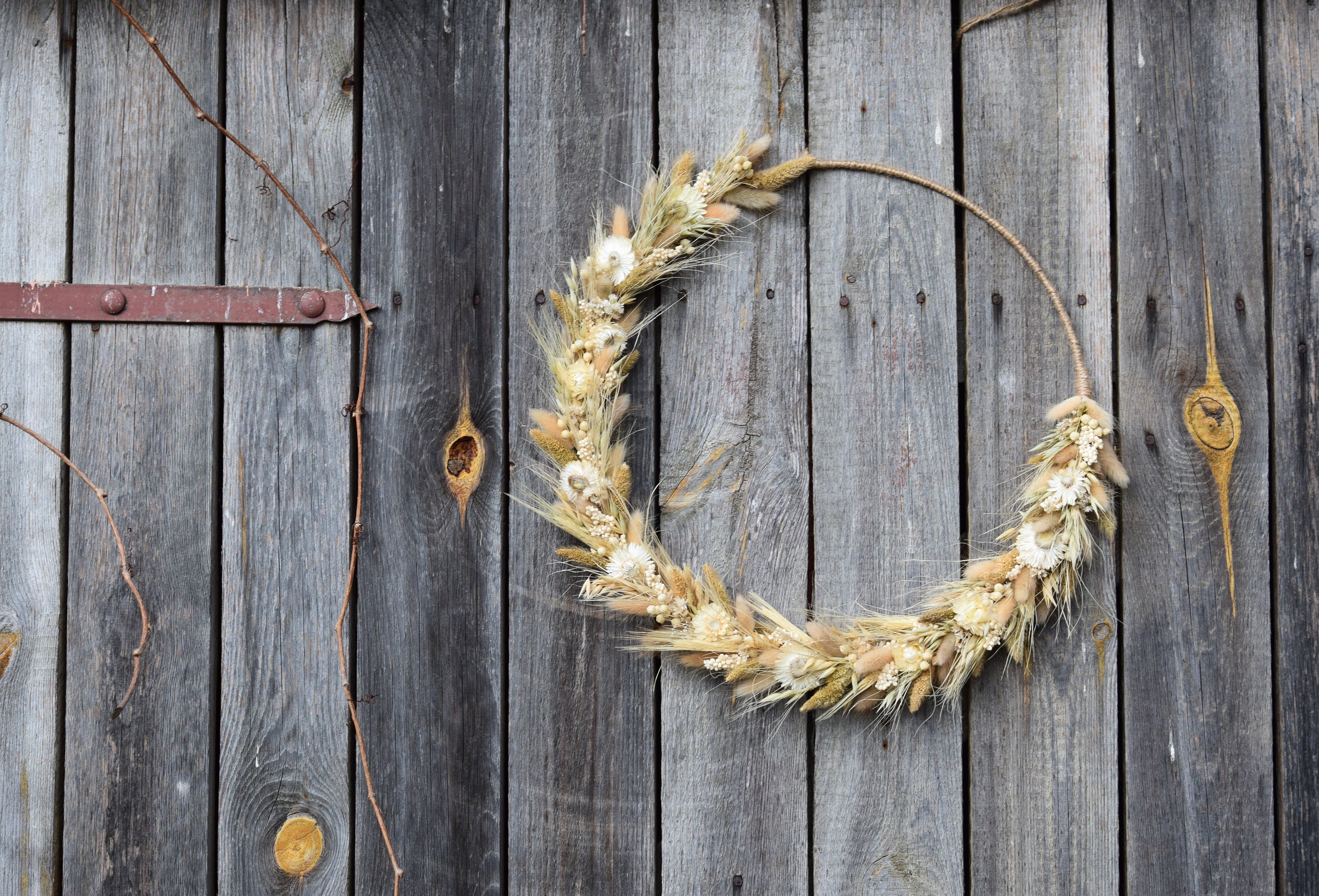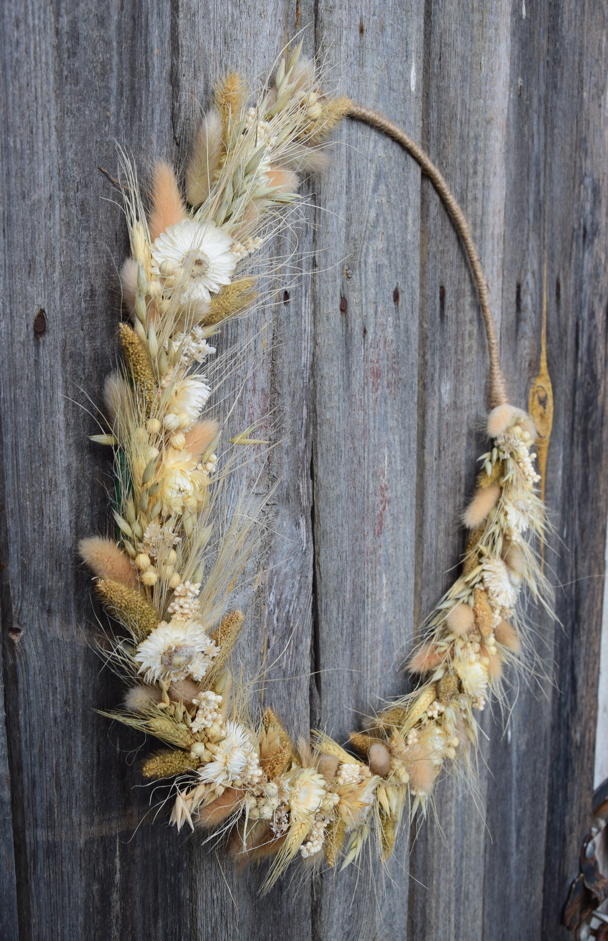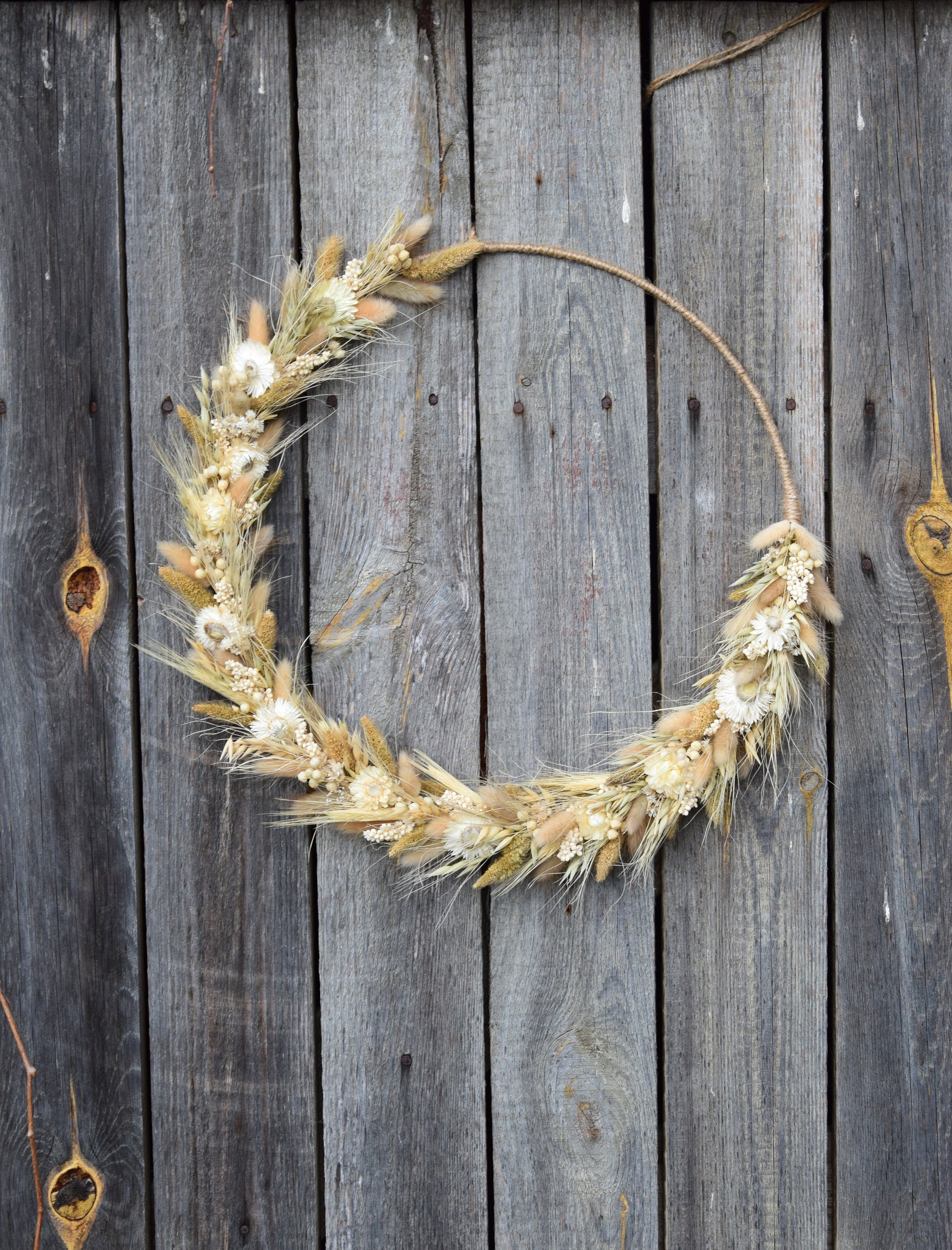Ten unikatowy, wiosenny wieniec będzie idealną dekoracją do Twojego domu lub biura. Sprawdzi się również jako piękny dodatek weselnego przyjęcia, imprezy urodzinowej lub innej uroczystości. Wieniec został ręcznie wykonany z suszonych zbóż i kwiatów na obręczy oplecionej jutowym sznurkiem. Aby był piękny przez wiele lat wystarczy trzymać go z dala od deszczu lub wilgoci. Ze względu na ręcznie robiony charakter moich wieńców, każdy jest wyjątkowy i niepowtarzalny. Średnica wieńca to 40 cm / 16. Jeśli chciałbyś zamówić więcej sztuk niż widzisz na liście, napisz do mnie , a ja z przyjemnością stworzę wybrana ilość dla Ciebie. Mogę też wykonać taki wianek w innym rozmiarze. Wiele z moich produktów to projekty indywidualne które tworzę na Wasze specjalne zamówienie. Byłabym bardzo szczęśliwa mogąc pracować z tobą, aby stworzyć dokładnie to, czego szukasz! Dziękuję za wizytę w naszym sklepie.