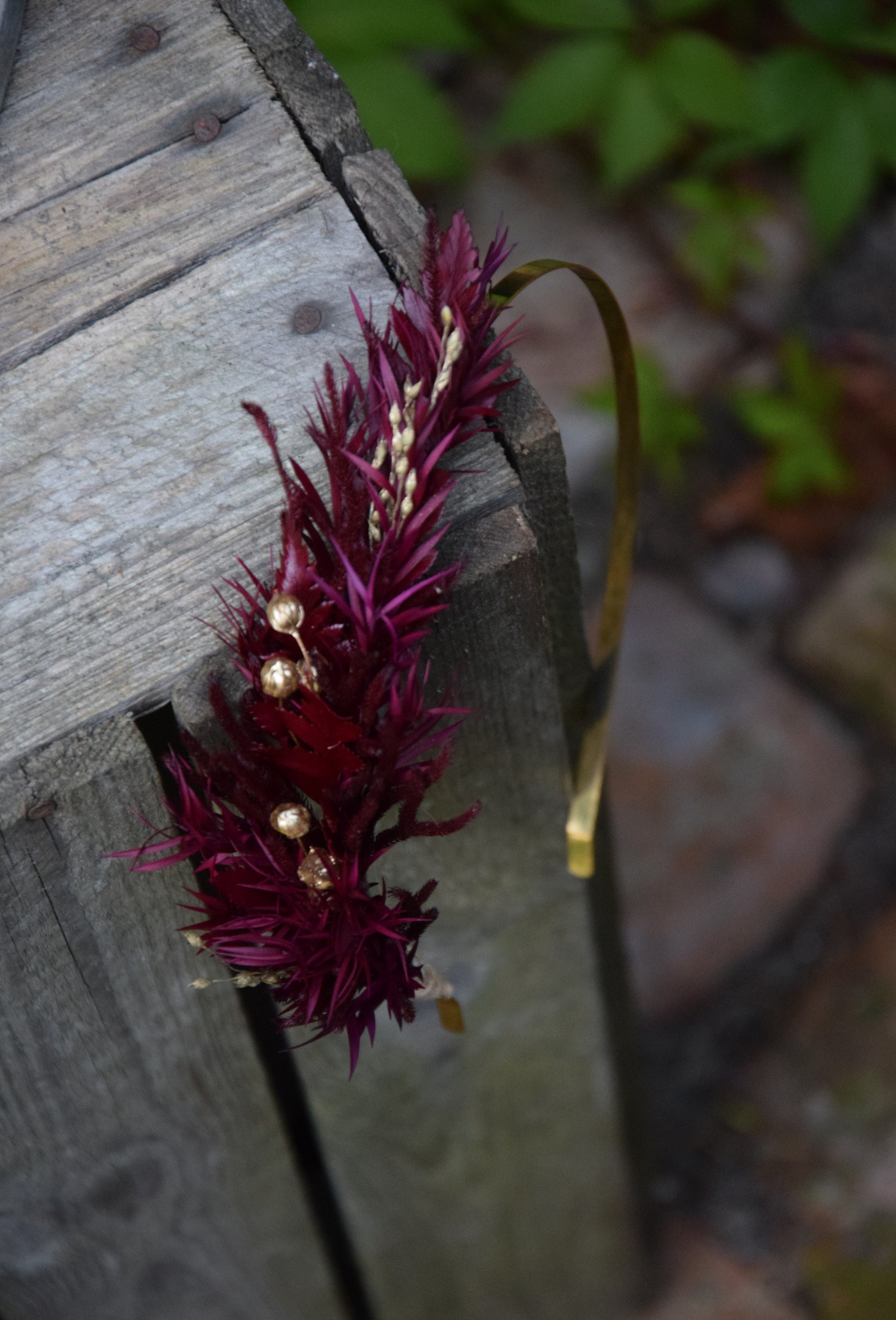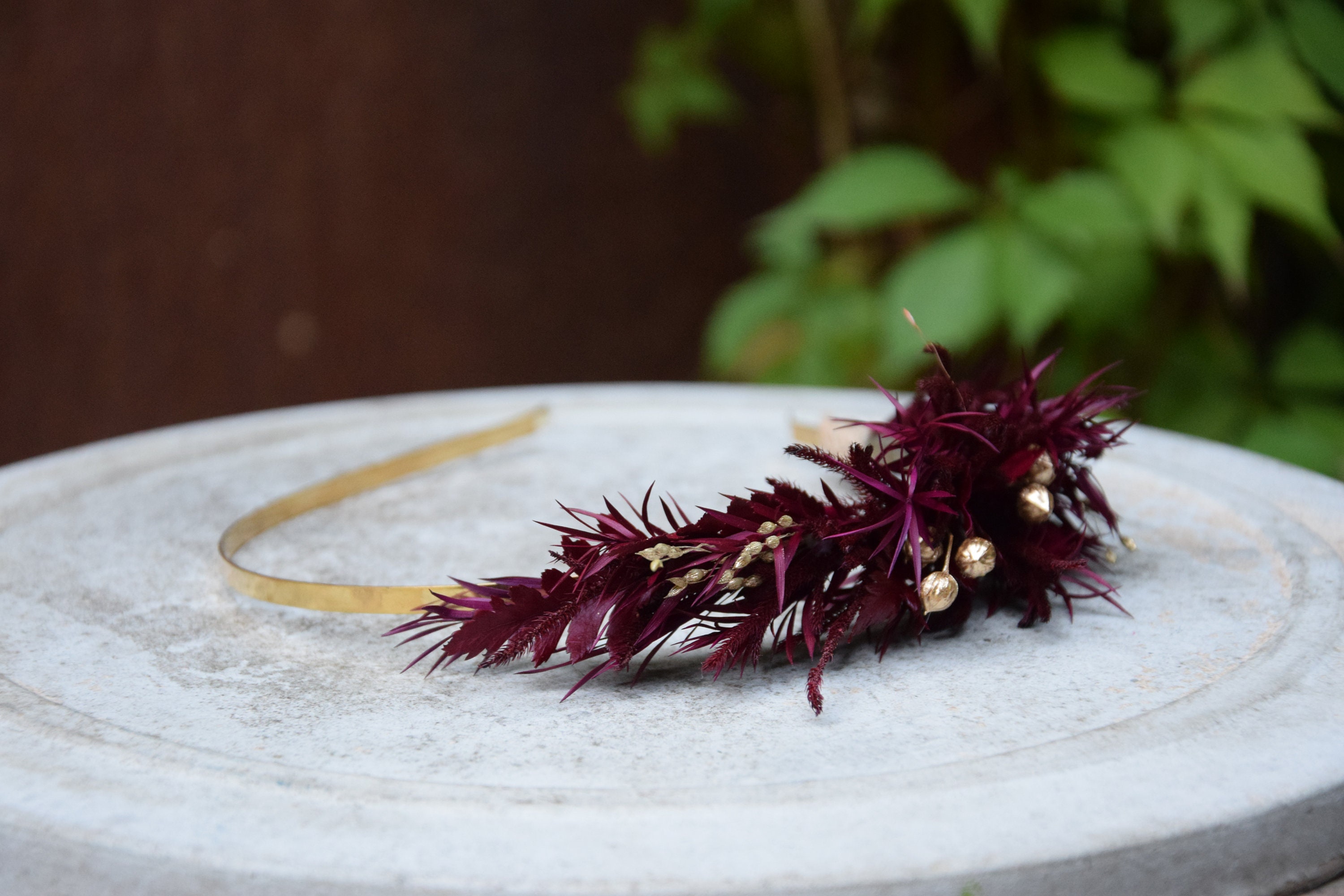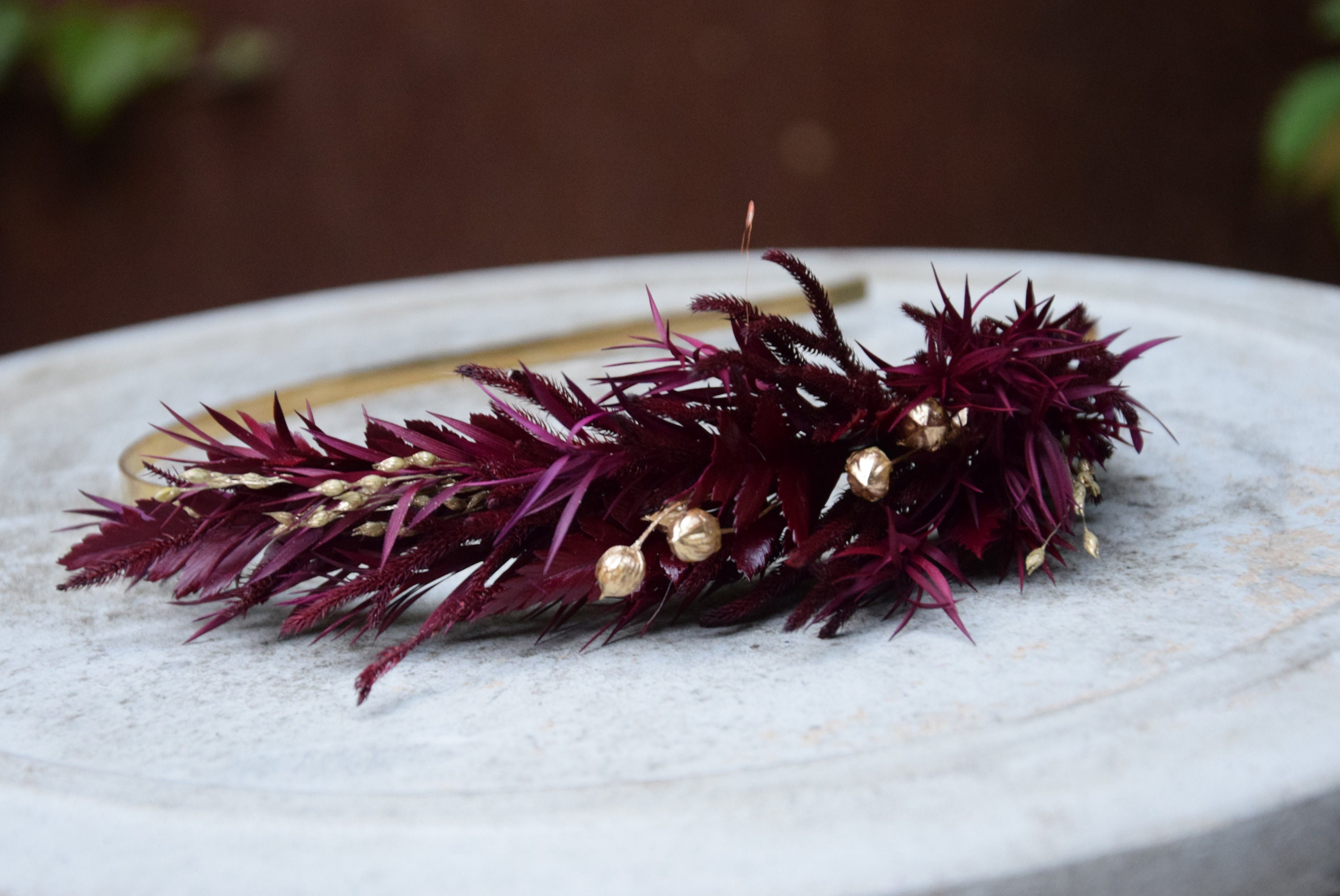 Przedstawiamy naszą wykwintną wakacyjną opaskę na głowę, stanowiącą idealne połączenie elegancji i świątecznej radości. Ta wyjątkowa opaska na głowę, wykonana ze stabilizowanych i suszonych roślin, dodaje odrobinę magii każdemu zestawowi panny młodej lub druhny. Metalowa podstawa, ozdobiona bogatym złotem, uzupełnia żywe odcienie fioletu i lniane akcenty, tworząc naprawdę czarujący dodatek. Idealna na uroczystości bożonarodzeniowe i imprezy zimowe, ta opaska jest również idealna na wieczory panieńskie, sesje zdjęciowe, festiwale lub urodziny.