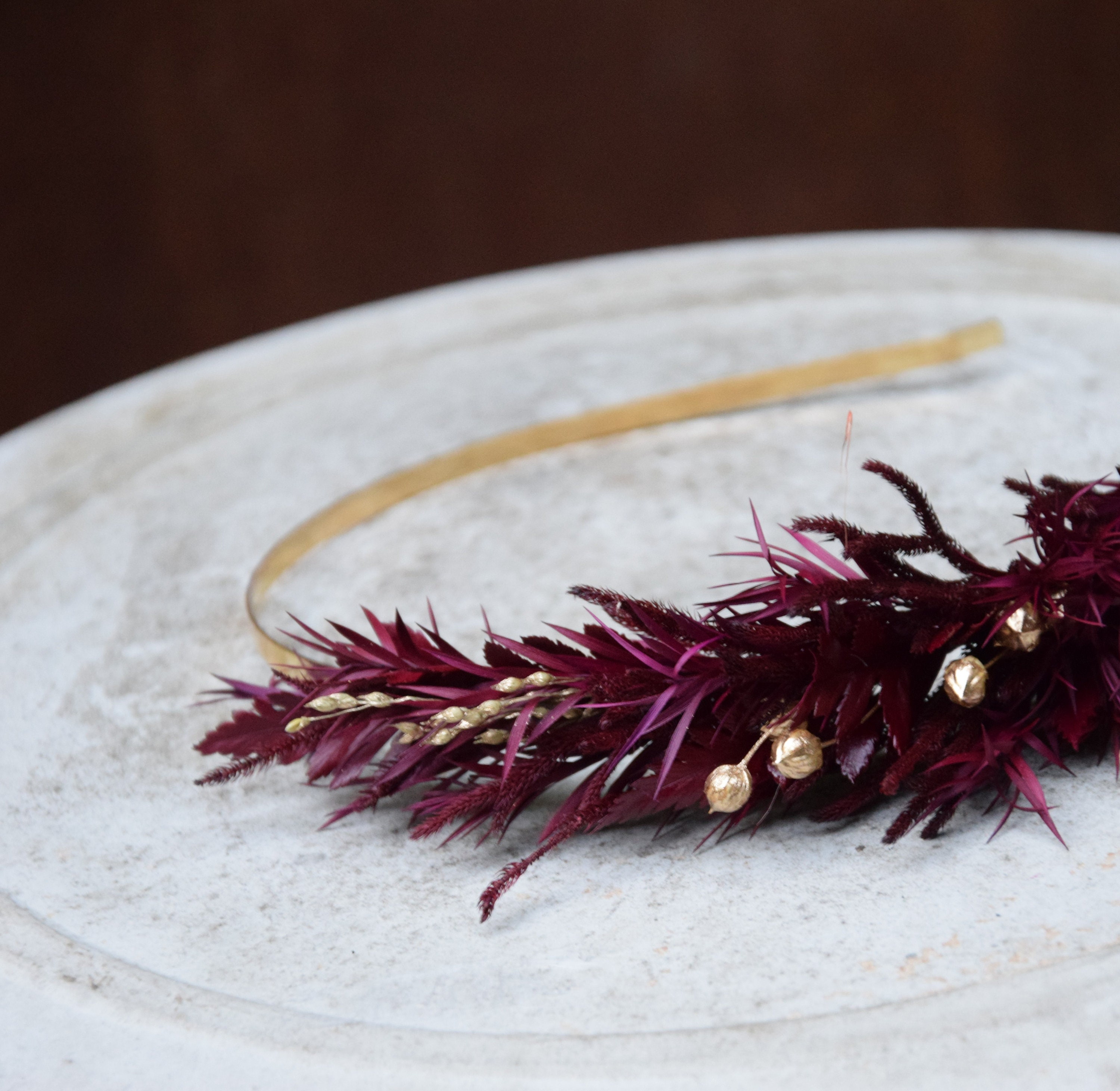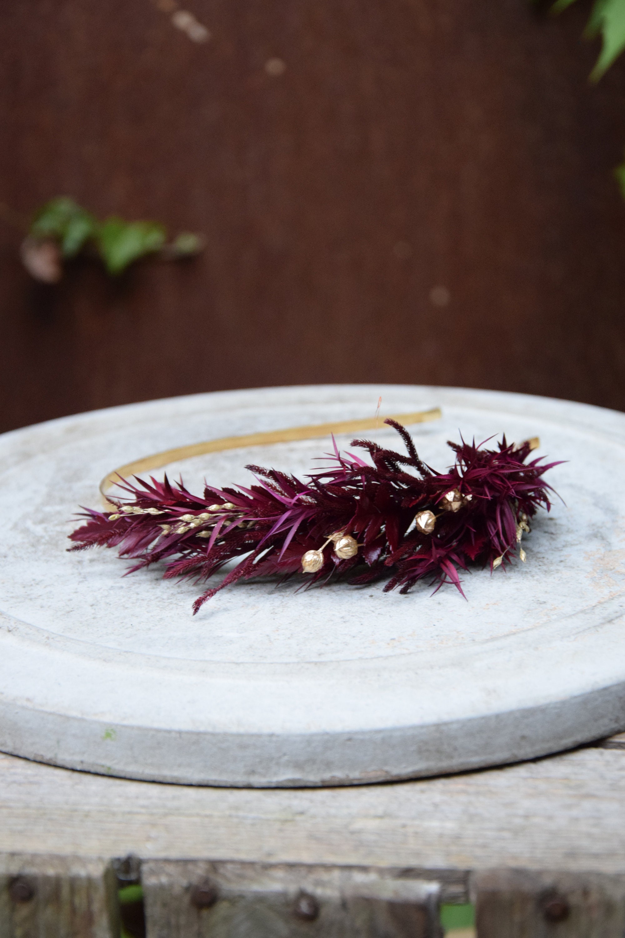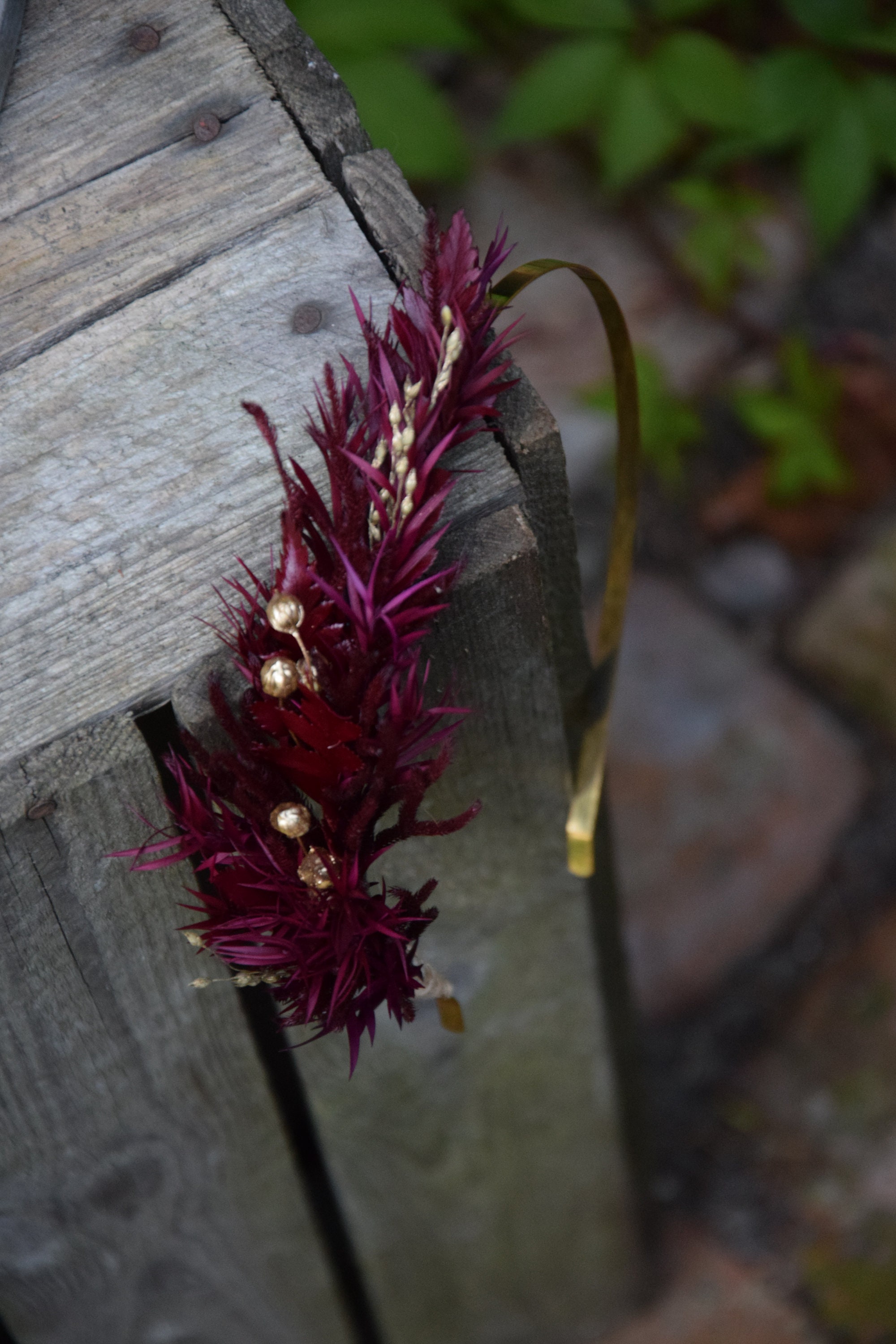 Przedstawiamy naszą wykwintną wakacyjną opaskę na głowę, stanowiącą idealne połączenie elegancji i świątecznej radości. Ta wyjątkowa opaska na głowę, wykonana ze stabilizowanych i suszonych roślin, dodaje odrobinę magii każdemu zestawowi panny młodej lub druhny. Metalowa podstawa, ozdobiona bogatym złotem, uzupełnia żywe odcienie fioletu i lniane akcenty, tworząc naprawdę czarujący dodatek. Idealna na uroczystości bożonarodzeniowe i imprezy zimowe, ta opaska jest również idealna na wieczory panieńskie, sesje zdjęciowe, festiwale lub urodziny.