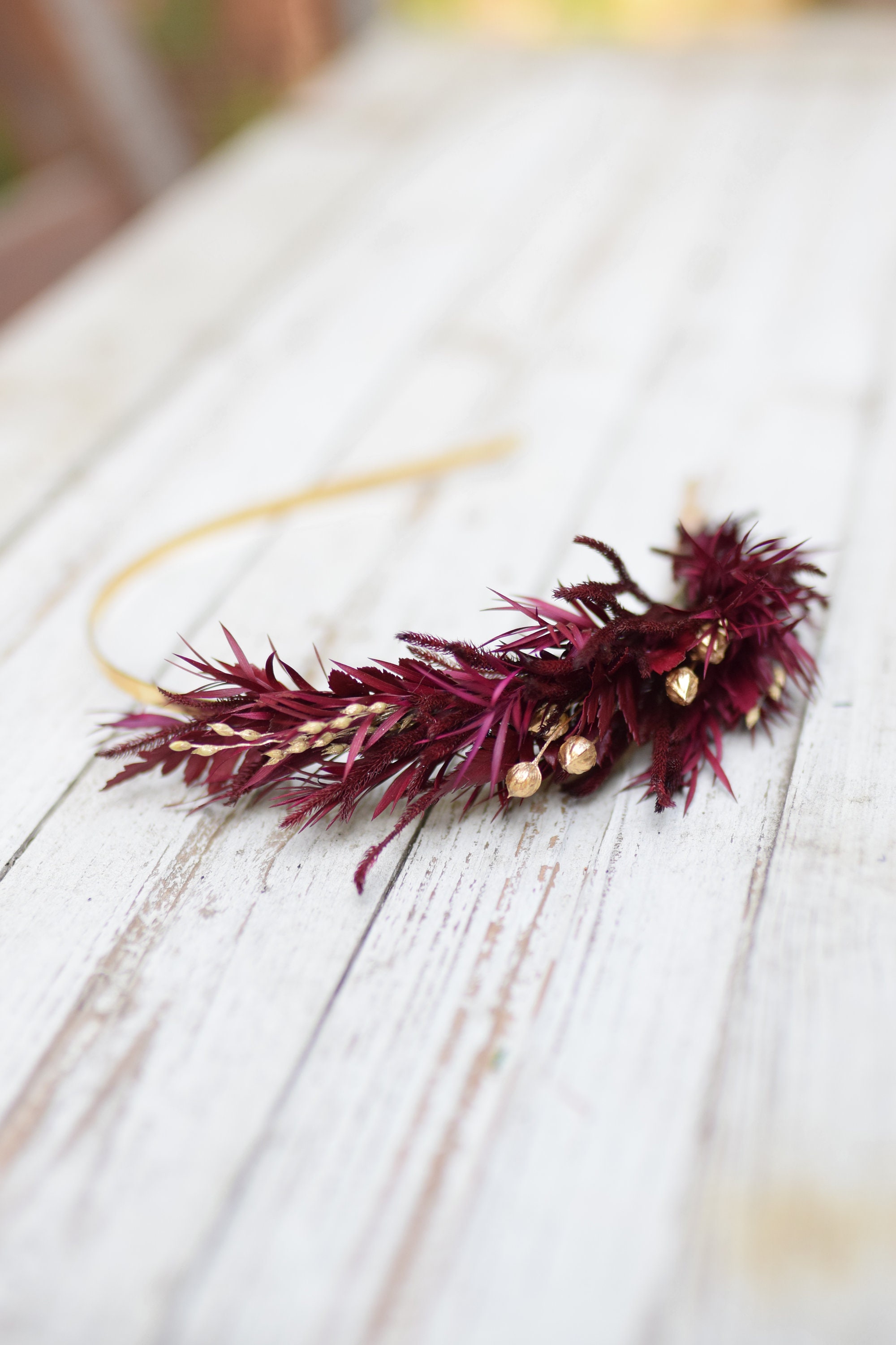 Czarująca fioletowo-złota świąteczna opaska na głowę – świąteczna korona z kwiatami z lnianymi akcentami.
