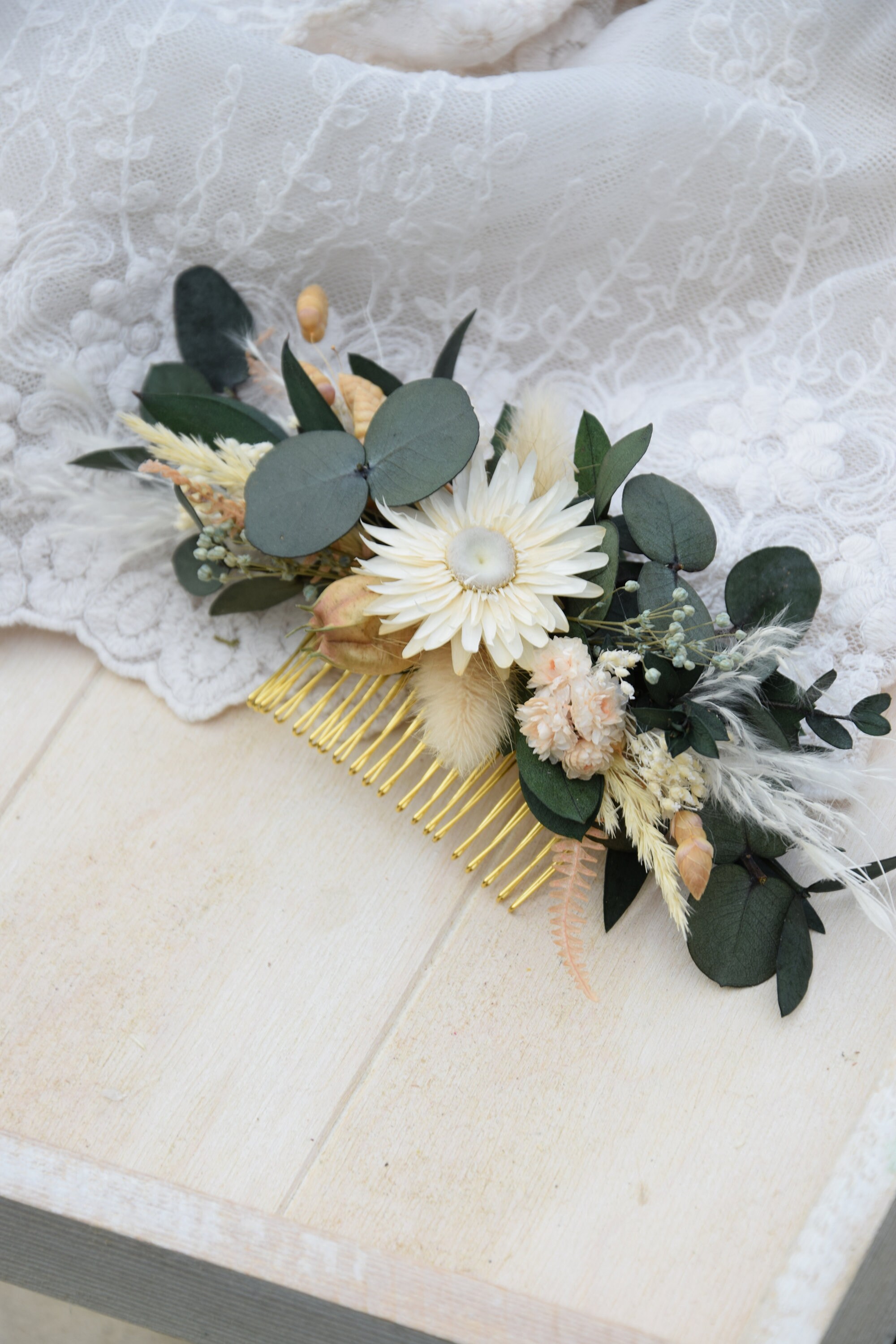 Romantyczny grzebyk do włosów z suszonych kwiatów to idealny dodatek do stylizacji Panny młodej lub druhny. W tym unikatowym grzebyku do włosów znajduje się len, suszone kwiaty oraz kłosy wielu zbóż. Grzebyk do włosów wykonany jest z niezwykłą dbałością o szczegóły. Grzebyk do włosów z suszonych kwiatów to idealna propozycja na ślub w klimacie rustykalnym, folkowym lub country. Świetnie sprawdzi się tez jako niespotykany dodatek na wieczór panieński oraz prezent, sesję zdjęciową, festiwal lub urodziny. Grzebyk wykonany jest na metalowej bazie i ma 14 cm długości oraz 6 cm wysokości. Kompozycja wykonana jest z suszonych kwiatów zatem jest trwała. Aby była piękna przez bardzo długi czas wystarczy trzymać ja z dala od deszczu lub wilgoci. Jeśli chciałabyś zamówić więcej sztuk niż widzisz na liście, napisz do mnie , a ja z przyjemnością stworzę wybrana ilość dla Ciebie. Wianek na głowę to doskonała okazja na wyrażenie osobowości i stworzenie idealnego duetu ze stylizacją pana młodego Zatem może spodoba Ci się butonierka idealnie pasująca do tego bukietu. https://www.etsy.com/pl/listing/817670431/rustykalna-butonierka-dla-pana-modego?ref=shop_home_active_1 A może spodoba Ci się ten bukiet https://www.etsy.com/pl/listing/803792174/rustykalny-bukiet-lubny-dla-panny-modej?ref=shop_home_active_1&frs=1 Wiele z moich produktów to projekty indywidualne które tworzę na Wasze specjalne zamówienie. Byłabym bardzo szczęśliwa mogąc pracować z tobą, aby stworzyć dokładnie to, czego szukasz! Dziękuję za wizytę w naszym sklepie.