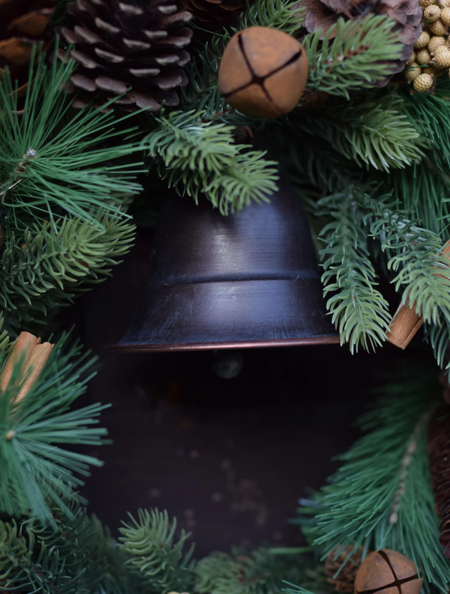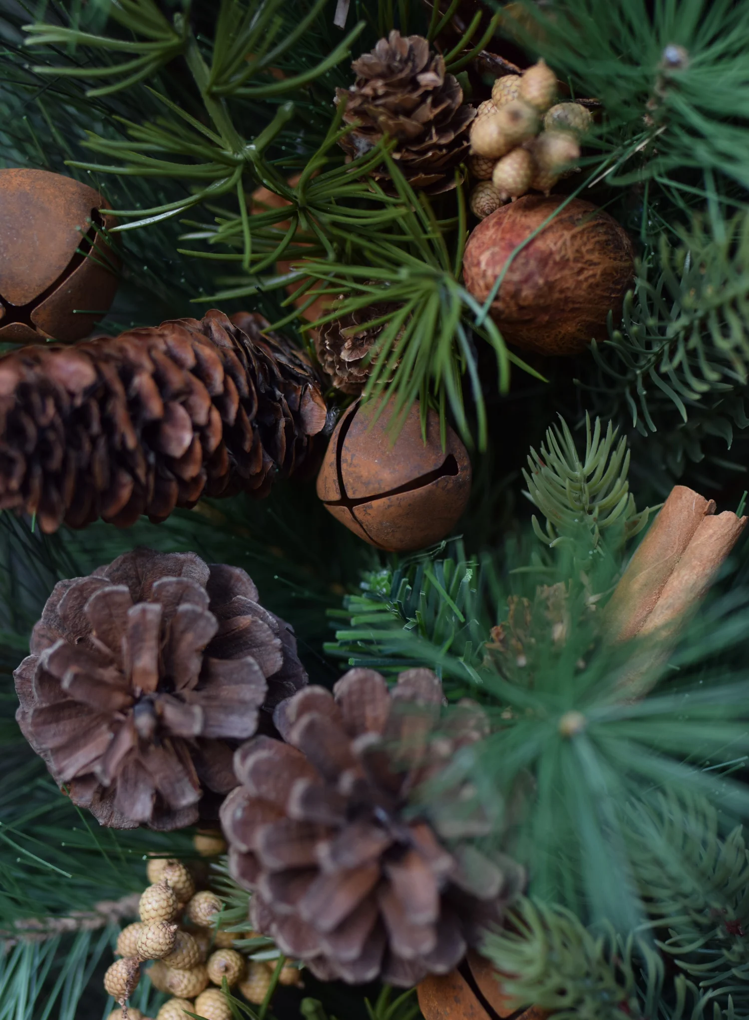 Udekorowany naturalnymi szyszkami i cynamonem oraz metalowymi dzwonkami w kolorze rdzy.