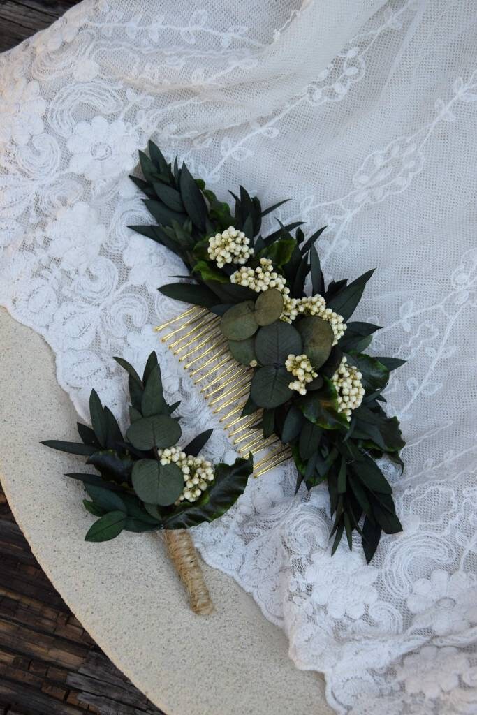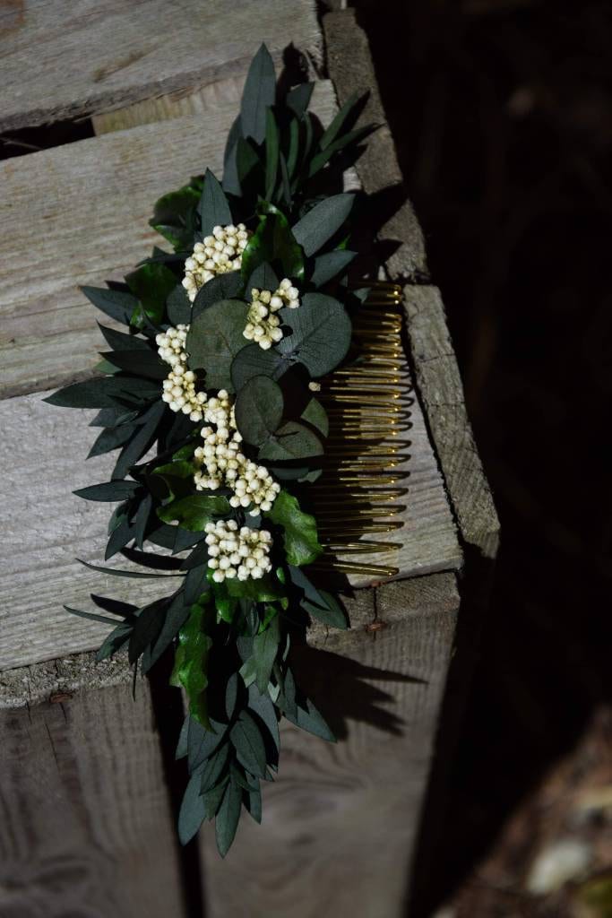 Romantyczny grzebyk do włosów z suszonych kwiatów to idealny dodatek do stylizacji Panny młodej lub druhny. W tym unikatowym grzebyku do włosów znajdują się stabilizowane liście eukaliptusa, rozmarynu i inne zielone listki. Grzebyk do włosów wykonany jest z niezwykłą dbałością o szczegóły. Grzebyk do włosów z suszonych kwiatów to idealna propozycja na ślub w klimacie rustykalnym, folkowym lub country. Świetnie sprawdzi się tez jako niespotykany dodatek na wieczór panieński oraz prezent, sesję zdjęciową, festiwal lub urodziny. Grzebyk wykonany jest na metalowej bazie i ma około 14 cm długości oraz około 6 cm wysokości. Kompozycja wykonana jest z suszonych kwiatów zatem jest trwała. Aby była piękna przez bardzo długi czas wystarczy trzymać ja z dala od deszczu lub wilgoci. Jeśli chciałabyś zamówić więcej sztuk niż widzisz na liście, napisz do mnie , a ja z przyjemnością stworzę wybrana ilość dla Ciebie. Wiele z moich produktów to projekty indywidualne które tworzę na Wasze specjalne zamówienie. Byłabym bardzo szczęśliwa mogąc pracować z tobą, aby stworzyć dokładnie to, czego szukasz! Dziękuję za wizytę w naszym sklepie.
