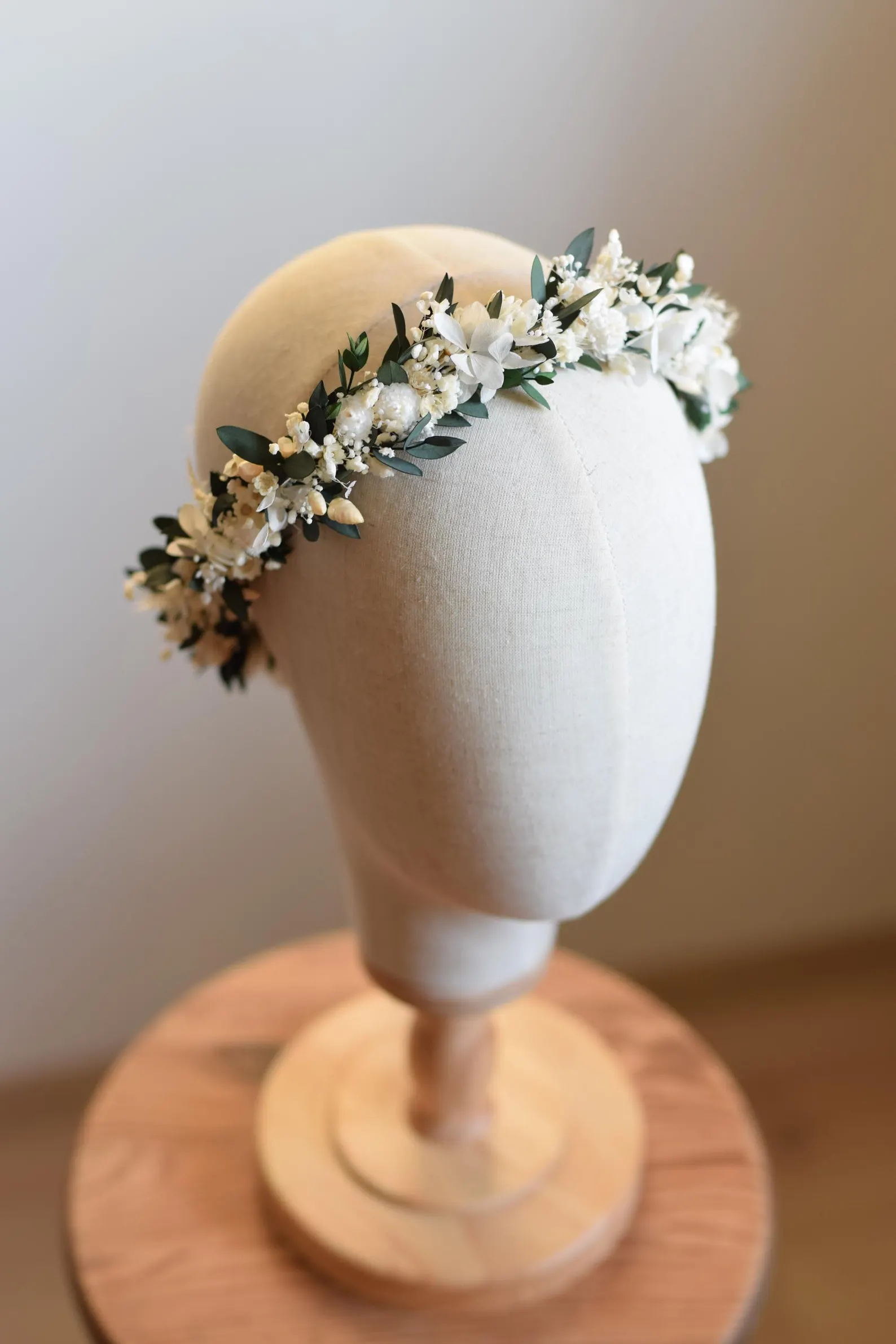 - Komunijny wianek na głowę z eukaliptusem i białymi kwiatami - 180 zł